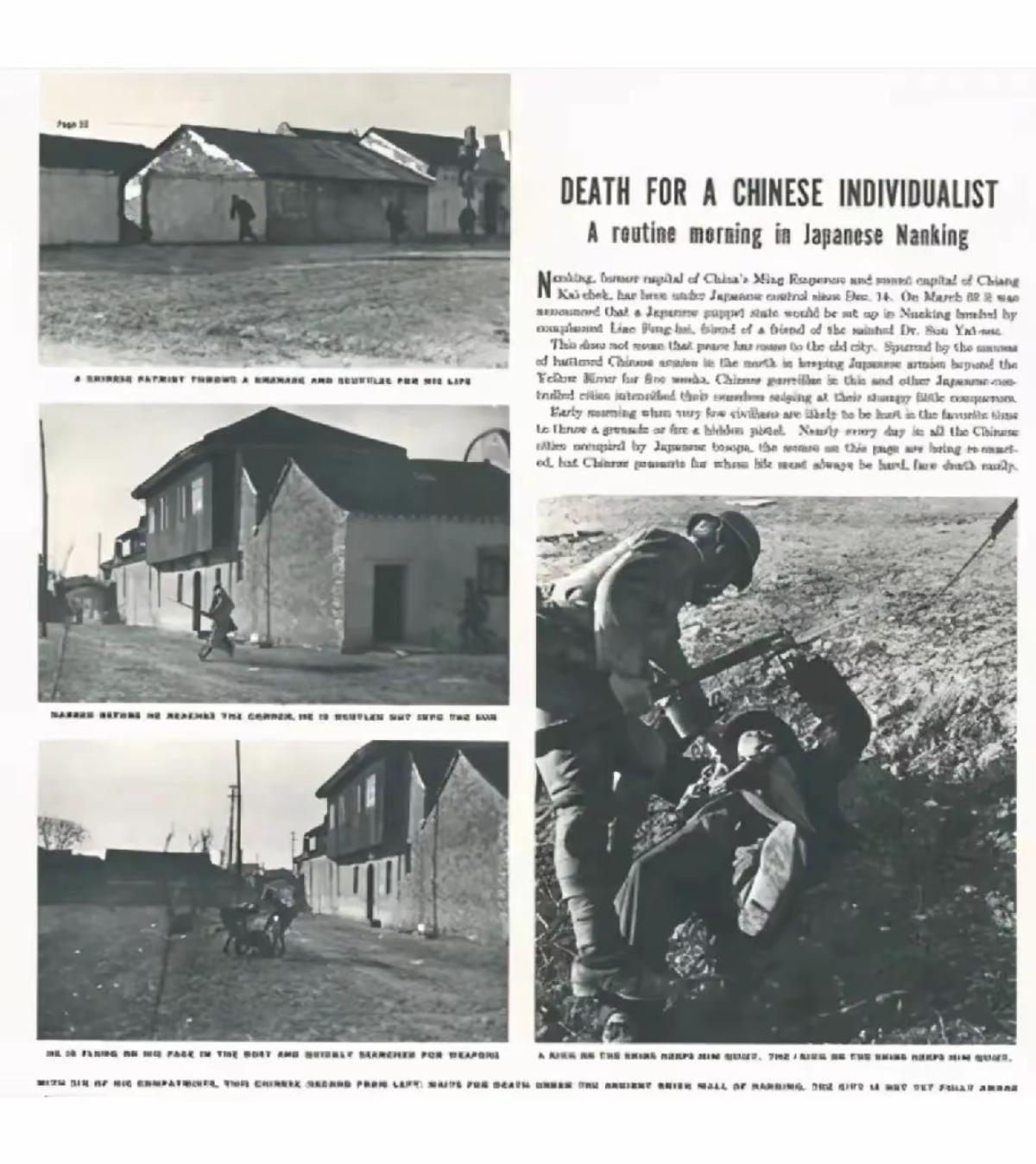 1938年3月24日,南京 一处日军营地的大门外,值勤的哨兵正在换岗时,突然,从附近的一个胡同里,飞奔出一个身穿国军军装的战士,他赤手空拳,飞快地朝日军营地冲去。两个哨兵发现了这一情况,立刻端着步枪冲向中国士兵,将他打倒在地。令日军大惊失色的是,他们从战士的身上搜出了一枚手榴弹。日军判断,这名身穿军装,戴着钢盔的战士,是要冲进营区,与日军同归于尽。 当时,南京城正逐步恢复秩序,在几个月前连续六周的大屠杀后,已见不到穿军装的中国士兵了,突然又出来一个一身军装的中国士兵,而且以必死的决心要与日寇同归于尽,着实让日军吃惊不小。在经过一番残酷的审讯后,英雄没有说出任何东西,最终被日军乱刀刺死。 致敬,为国捐躯的抗日无名英雄! 当时的美国报纸刊登并报道了这件事情…