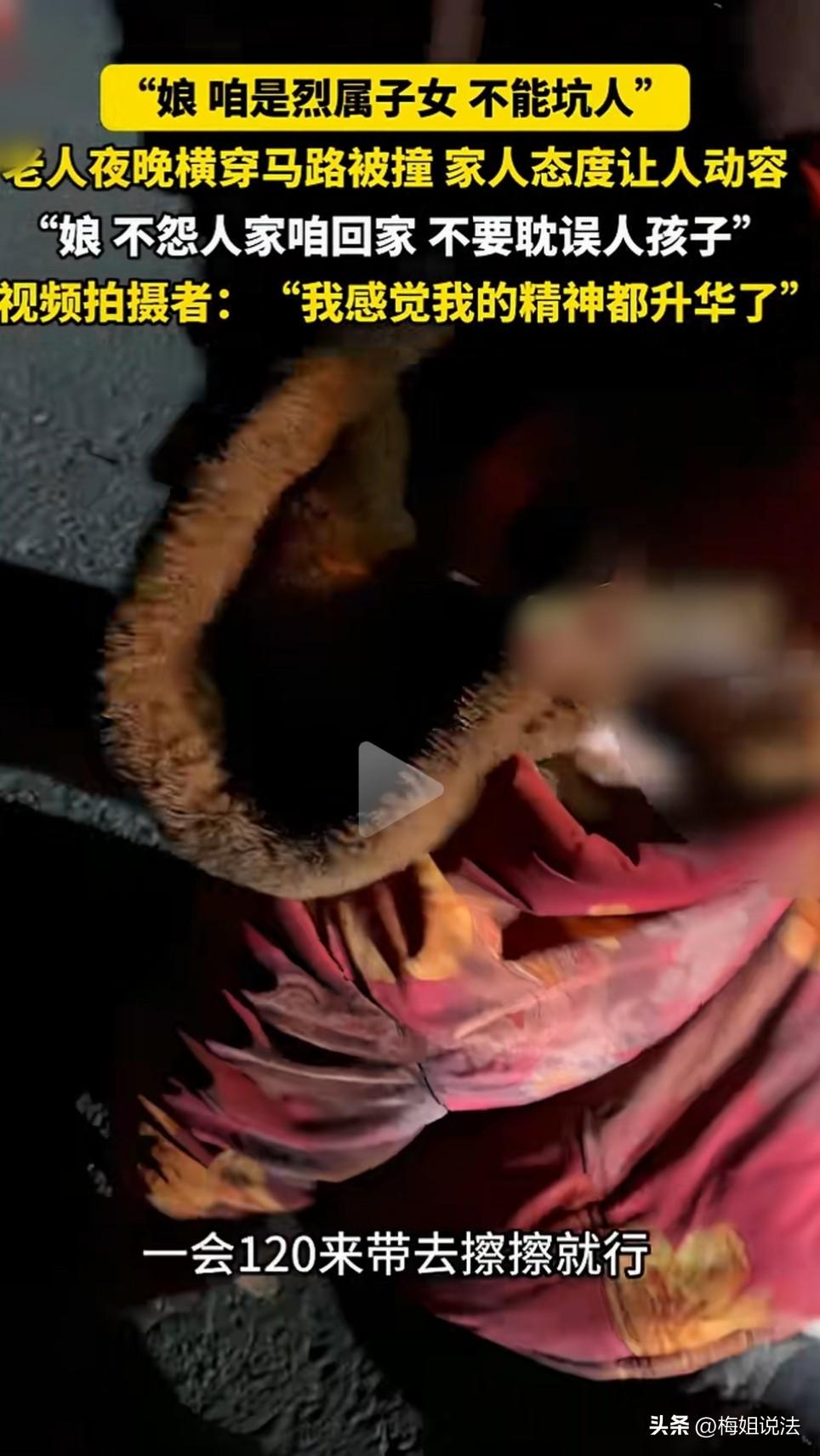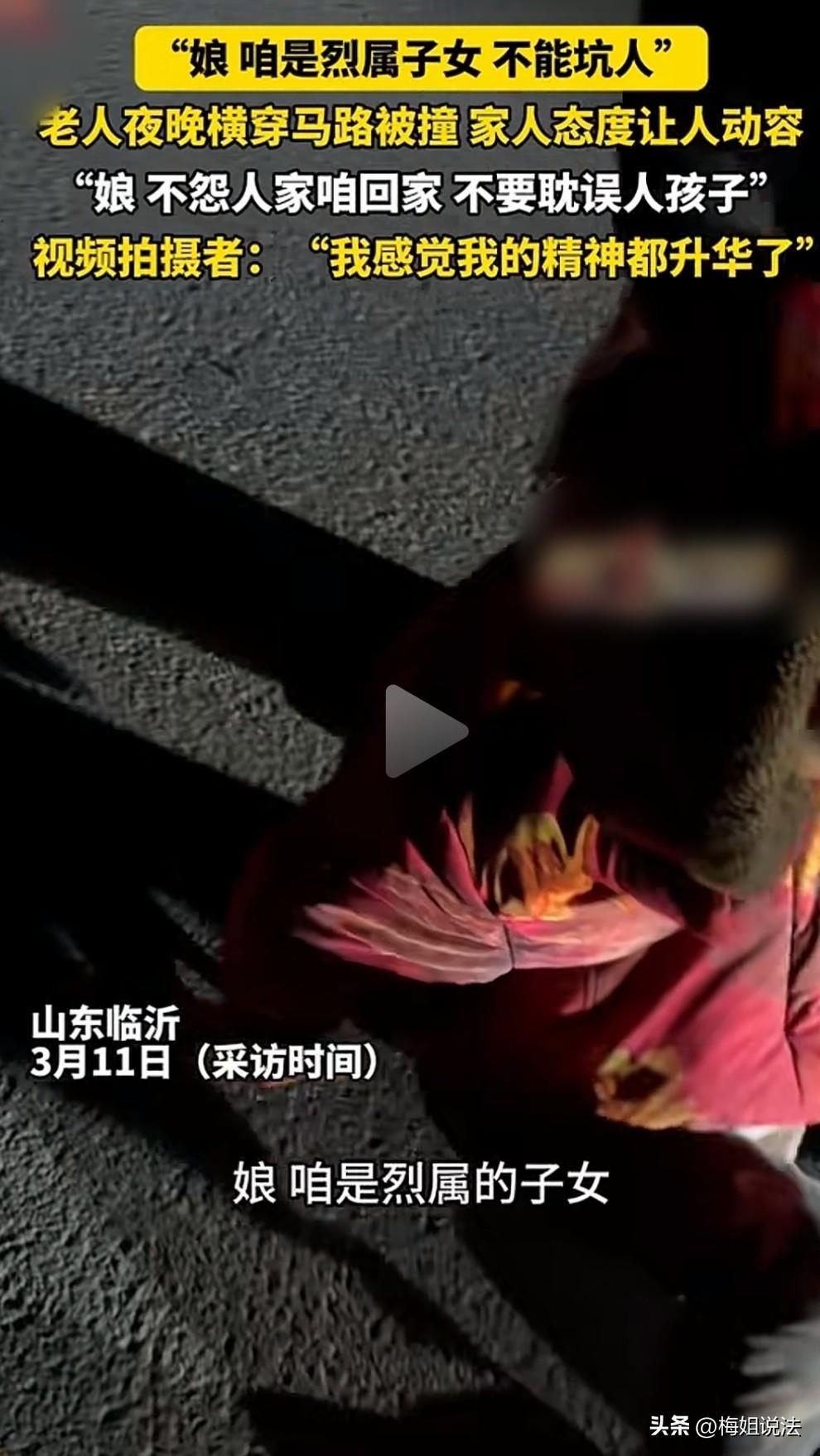 烈属子女不坑人!山东临沂,老太太晚上横穿马路被撞,司机赶紧下车查看,眼看老太太已经倒地上起不来了,她的儿子急匆匆赶到,司机觉得自己完了,没想到大娘儿子一句话,让司机傻眼了。 山东临沂,正月十五元宵佳节,忙碌了一天李先生,开车走在回家的路上,想到等着自己团聚的家人,李先生心里暖暖的。 看着车窗外的风景,李先生感到了浓浓的节日氛围。 忽然,李先生看到不远处好像发生了交通事故,一个人躺在路上。 这大过年的,被车撞了得多难受啊。李先生是个热心肠的人,他没有选择躲开,于是就把车停到一边,打算过去帮忙。 停好车以后,走近一看,一个满头白发的老太太躺在路上,好像站不起了。 这撞人的司机完了,老太太这么大岁数了,这司机以后得给她养老了。想到此处,李先生不禁为站在旁边的司机捏了一把冷汗。 但是令他意外的是,被撞的老太太特别的仁义,一点都不打算追究撞她的司机。 只见这老太太努力的想要爬起来,嘴里还说着:我没事,我没事,不用你们管,你们走吧。 李先生开车这么多年,头一次见到这样的老太太,自己被撞了,还赶司机走的人。 看着躺在地上的老太太,她的帽子已经撞飞了,鞋子也撞掉了,白头发乱七八糟,李先生对她是又心疼又敬佩。 李先生赶紧走上前,劝住想要爬起来的老人,说道:你别动别动,躺着就行,我看看附近有没有医院,得赶紧报警。 但被撞老太太坚决不让他报警,非说自己没事。 李先生非常感动,马上掏出了手机搜索附近位置,就在这时,老太太的儿子慌里慌张地赶过来了。 这老太太不让司机赔付,那她的儿子也能不让赔?李先生心想,这撞人的司机,肯定是完了。 不过真实的情况,又一次打了李先生的脸,这个儿子接下来说的话,让李先生感动的一塌糊涂。 看到自己老娘被撞,她的儿子一脸的愧疚,赶忙想搀起老太太,嘴上不停地说:不怨人家,是我没照顾好你。走,娘,一会坐我的车回家。 他一边试图扶起自己的老娘,一边害怕耽误司机的行程,不停的说:娘,别耽误人家孩子的事。 但是,她的老娘被撞的已经站不起来了,不管他怎么搀扶也搀扶不起来。 见状,他只能让老娘继续坐在地上,轻轻地抱着自己的老娘,用自己的身体给她取暖,还把脸紧紧的贴在自己老娘的脸上,安抚她害怕、不安的情绪。 李先生看到被撞老太太的帽子已经掉了,赶紧给老太太戴上。大娘的儿子一边安抚自己的老娘,一边说:娘,咱是烈属子女,不能坑人。 听着这样的话,看着这对衣着朴实、寒风中互相依偎的母子,李先生表示自己的精神世界都升华了。 随后,120车及时赶到了,将老太太拉上了车。到这个时候,他的儿子还表示没事,劝导自己的老娘,娘,没事,咱擦擦就好了,别耽误人家的事。 这对母子的善良真是让人感动!作为烈属子女,他们从来没有炫耀自己的身份,反而将它作为约束自身道德的一道标准,也成为他们家最硬的家风。 不过话说回来,虽然这对善良的母子坚决不追究撞人司机的责任,但是在从法律层面来讲,司机应该承担哪些责任呢? 《道路交通安全法》第76条规定,机动车与行人事故,机动车方通常担责;行人有过错可减轻,无过错则机动车方至少担10% 。 所以说,这起交通事故,无论老太太有无过错,司机都需要承担责任。 但这对母子特别善良,坚决不追究司机的法律责任,但司机赔付老太太一些医疗费、安慰安慰人家还是应该的。 正所谓英雄为国捐躯,后人以德立身。最后,祝愿他们好人一生平安吧。