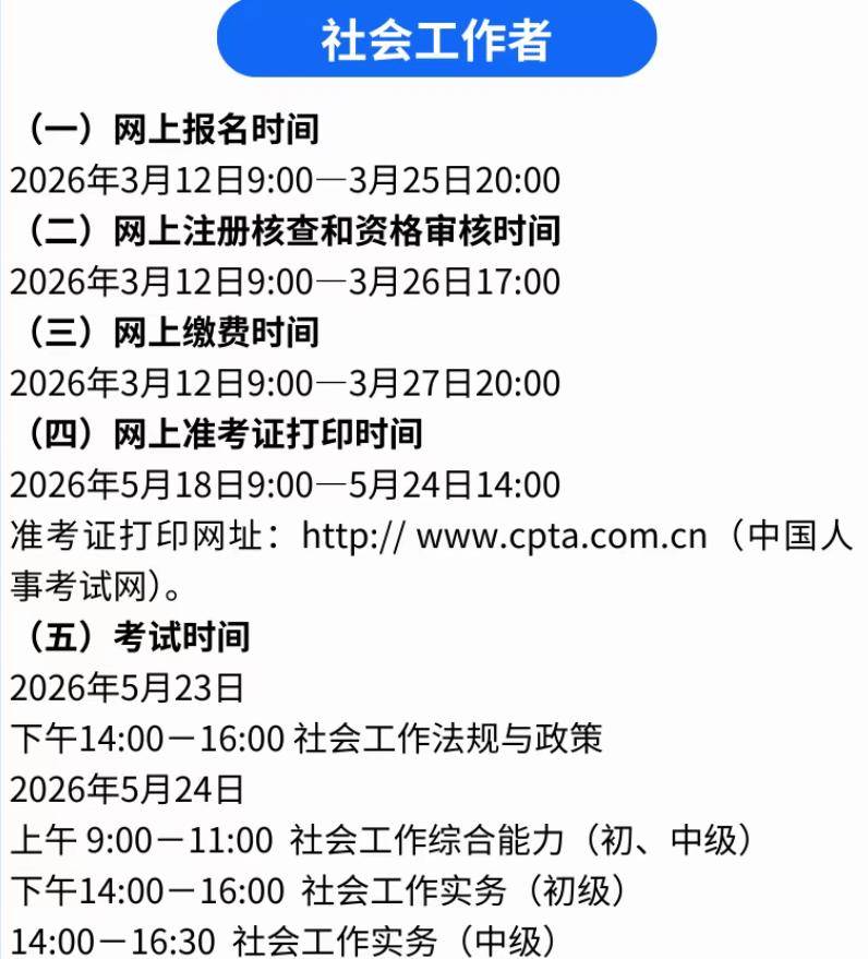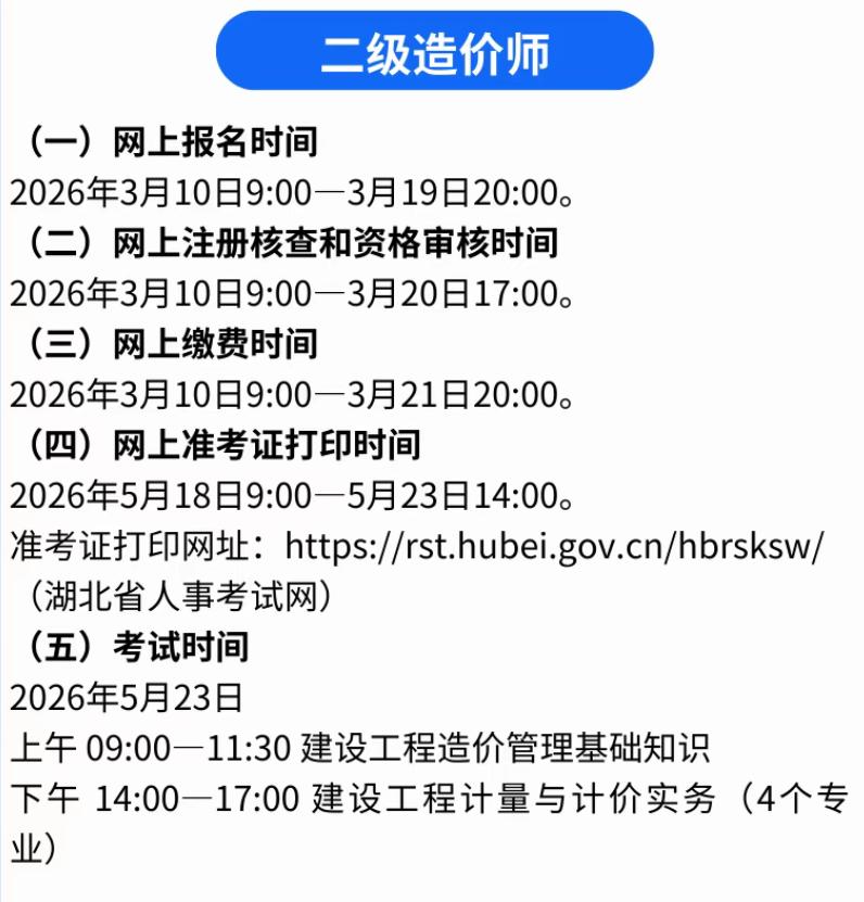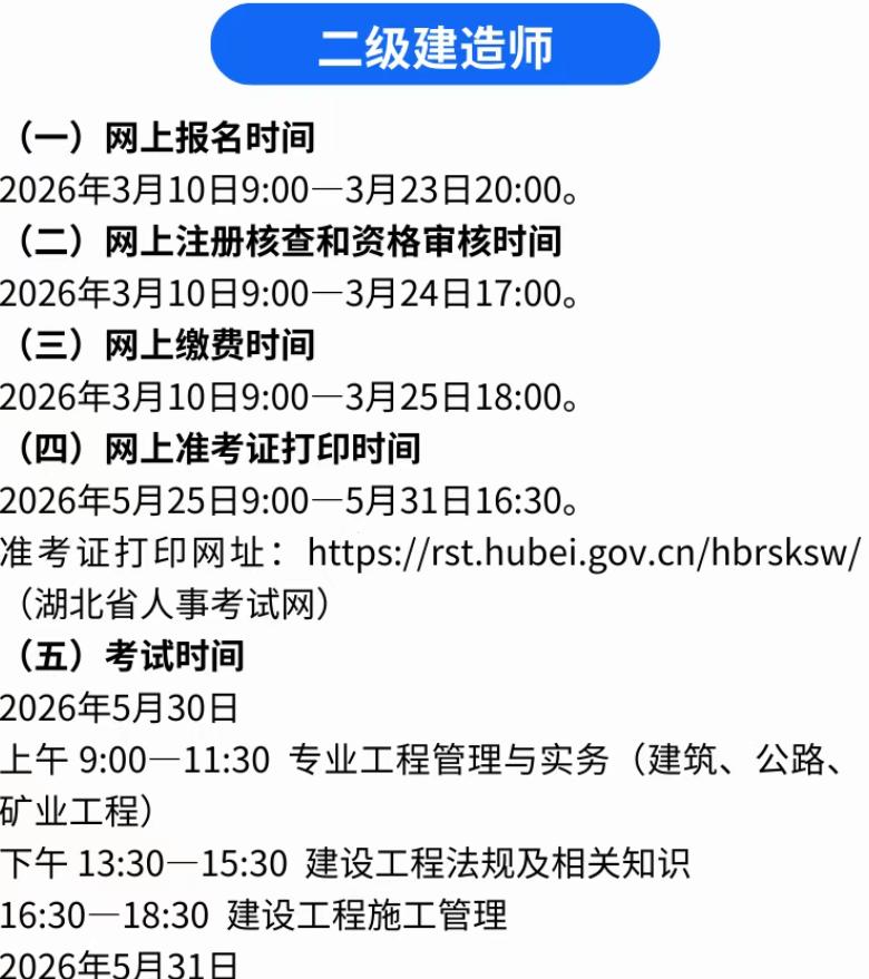 3类热门考试已开始报名,二级建造师、造价师、社工,别错过 备考的朋友赶紧看过来,三类热门职业资格考试已经正式开始报名,错过又要等一年,备考这么久可别白费功夫。 这次开始报名的分别是二级建造师、二级造价师和社会工作者考试,都是含金量不低、实用性强的考试,适合不同人群报考。 先说说二级建造师,目前多地已经启动报名,考试时间定在5月30日至31日,想从事工程施工管理的朋友别错过。 二建报考有明确要求,工程类或工程经济类中专以上学历,从事工程项目管理满2年就能报,非本专业学历需满4年工作经验。 二级造价师也同步开启报名,主要面向从事工程造价、工程管理的人员,考下来能提升竞争力,助力职业发展。 二造报考门槛不算高,工程造价专业大专学历满1年工作经验即可,其他专业学历的话,工作年限相应增加1年。 还有社会工作者考试,3月10日就已开启报名,截止到3月20日,想从事社工相关工作、考编加分的可以抓紧。 社工考试分初、中、高级,助理社工师高中学历满4年就能报,社工师需大专及以上学历,结合工作年限就能报考。 这三类考试报名都在中国人事考试网,线上就能操作,报名后记得及时缴费,逾期未缴费就算放弃报名资格。 很多人备考了大半年,就等着报名通道开启,可别因为粗心错过报名时间,不然又要多等一年,太可惜。 不管是想提升自身能力,还是想拓宽职业道路,这三类考试都值得报考,考下来对工作和薪资都有不少帮助。 报名期间记得仔细核对报考条件,准备好相关材料,避免因为材料不全、条件不符导致报名失败,白费功夫。 现在报名通道还在开放中,符合条件的朋友赶紧行动起来,认真备考、顺利报名,争取一次上岸、不负努力。