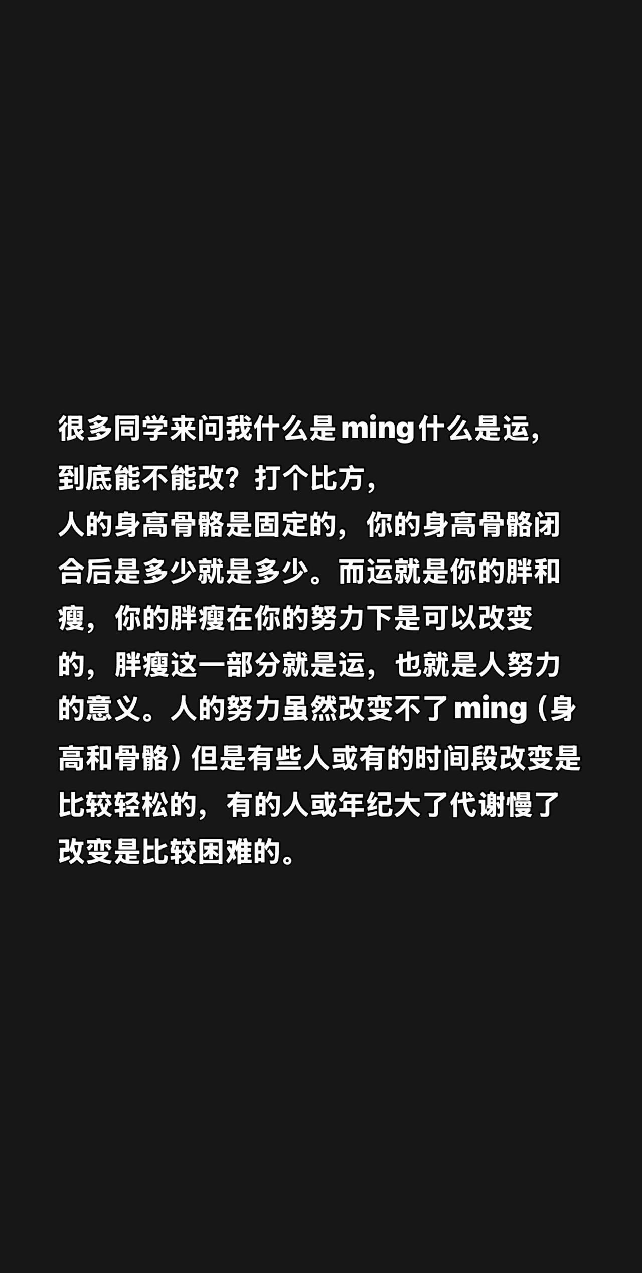 很多同学来问我什么是ming什么是运,到底能不能改?打个比方, 人的身高骨骼是固定的,你的身高骨骼闭合后是多少就是多少。而运就是你的胖和瘦,你的胖瘦在你的努力下是可以改变的,胖瘦这一部分就是运,也就是人努力的意义。人的努力虽然改变不了ming(身高和骨骼)但是有些人或有的时间段改变是比较轻松的,有的人或年纪大了代谢慢了改变是比较困难的。