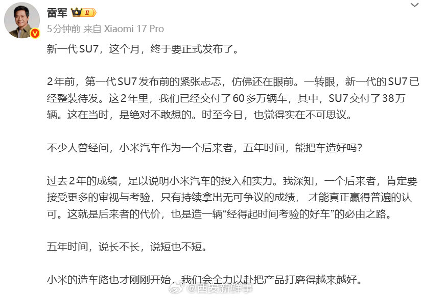 小米的造车路也才刚刚开始,我们会全力以赴把产品打磨得越来越好。五年前小米汽车刚出发时候定下的目标,就是打造一辆安全的好车,一辆令人向往的梦想之车。新一代SU7,就是我们最新的答卷!