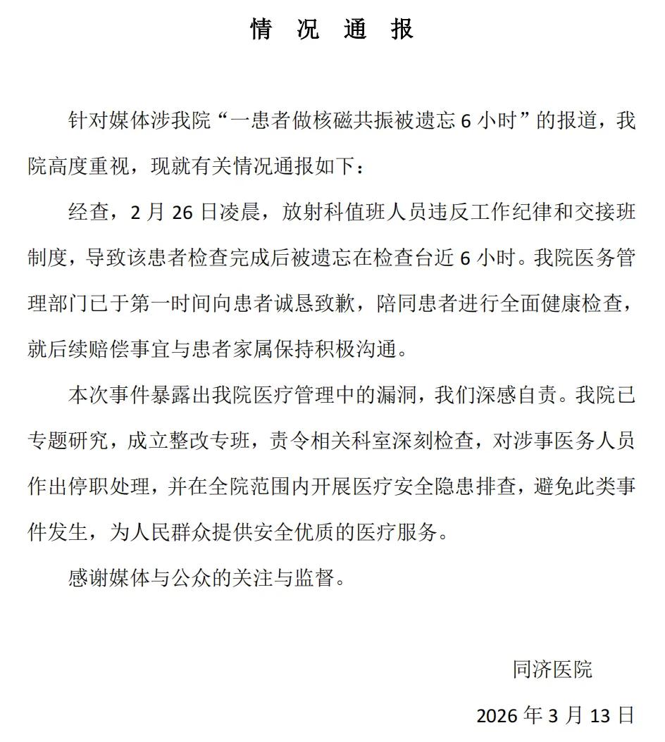 3月13日,华中科技大学同济医学院附属同济医院官网就“一患者做核磁共振被遗忘6小时”发布《情况通报》:经查,2月26日凌晨,放射科值班人员违反工作纪律和交接班制度,导致该患者检查完成后被遗忘在检查台近6小时。该院医务管理部门第一时间向患者诚恳致歉,陪同患者进行全面健康检查,就后续赔偿事宜与患者家属保持积极沟通。该院成立整改专班,责令相关科室深刻检查,对涉事医务人员作出停职处理。 [机智]评几句:做过核磁共振的病人都会知道,半小时的噪音都难以忍受。6小时太可怕了,深感同情。这不仅仅是身体上的折磨,更是人性的冷漠。 不得不说,同济医院在武汉确实“牛”得有口皆碑。那句武汉人耳熟能详的顺口溜:“还有一口气,赶紧送同济”,早已说明了一切。在这座城市,同济代表的是顶尖的医疗水准与救死扶伤的底线。无论是昂贵精密的医疗设备,还是技艺超群的医生团队,其硬实力在业内都响当当。 然而,这起事故却像一记响亮的耳光,狠狠抽在了这份荣誉上。它凸现出的问题,远比设备先进与否更加刺眼:在庞大而现代化的医院体系下,人文关怀的缺失到底到了何种地步?制度的漏洞又是如何让冷冰冰的机器凌驾于活生生的人命之上?当“救死扶伤”变成了机械的流程操作,当“同济”二字只成了招牌而无初心时,再先进的仪器也掩盖不了管理上的溃败。这是对医疗行业底线的严重挑衅,必须引以为戒,不仅要追责,更要从根源上重塑敬畏生命的职业素养。 这也给所有大医院提了个醒:越是牛的医院,越要守住人心的底线。
