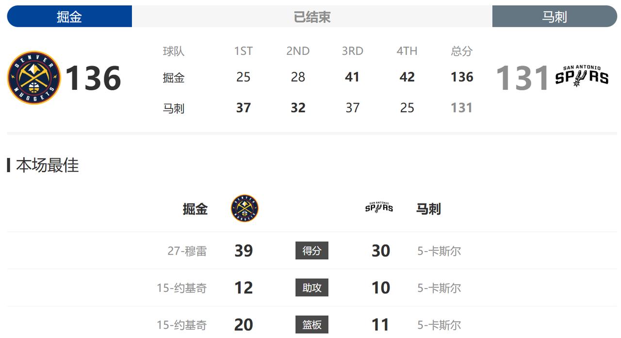 没想到马刺被掘金给逆转了! 本来文班亚马今天不打,我一开始是更看好掘金赢球的,但没想到比赛一开始掘金就被马刺打爆了,第二节打到一半的时候,马刺就已经领先20分了,然后我就去看了雷霆和凯尔特人的比赛……