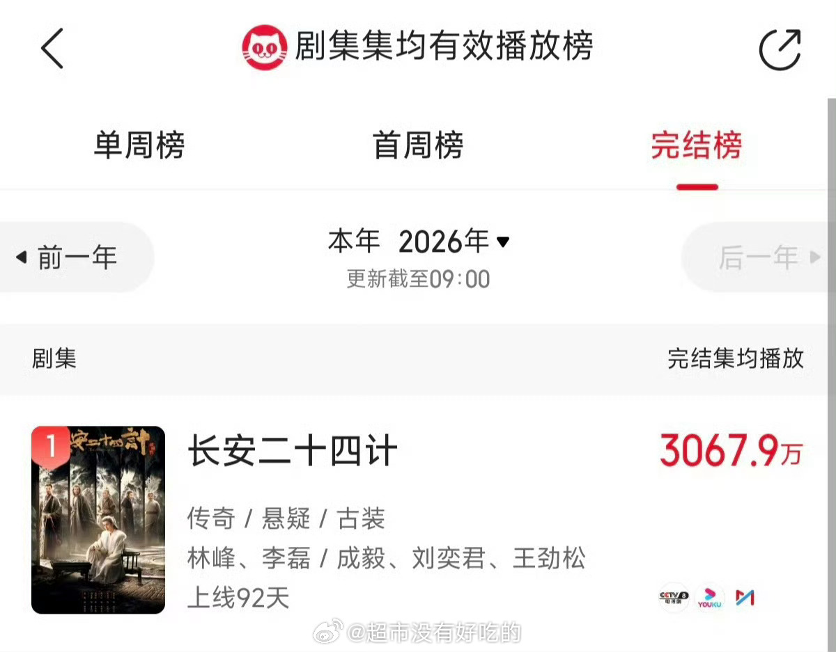 成毅《长安二十四计》抖平台话题播放量破40亿!截止目前,以3067.9万集均有效播放量登顶2026年猫眼剧集完结榜TOP1🏆成毅成毅