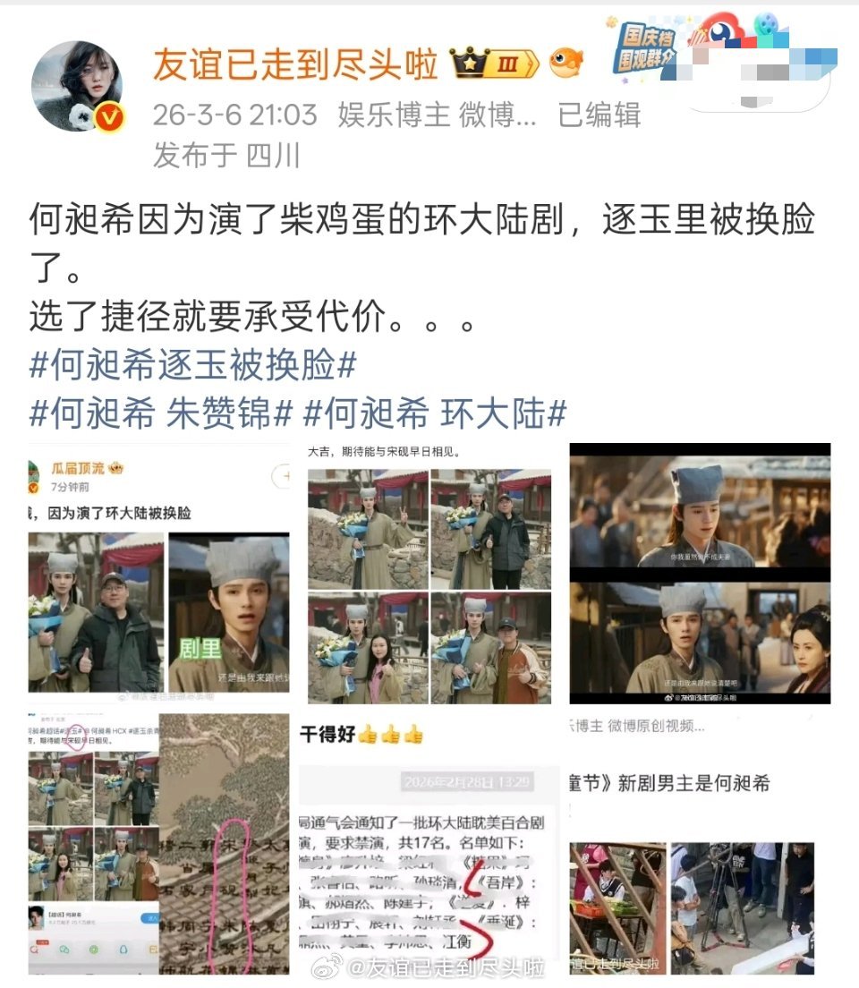 何昶希因为演环大陆剧,做配角的剧被换脸,今天他的环大陆剧上线,两个主角还上🧣宣传,这个宣传文案也是很挑衅,知道不让演现在还要赤裸裸麦麸建议浪把这剧在浪的宣传都禁了