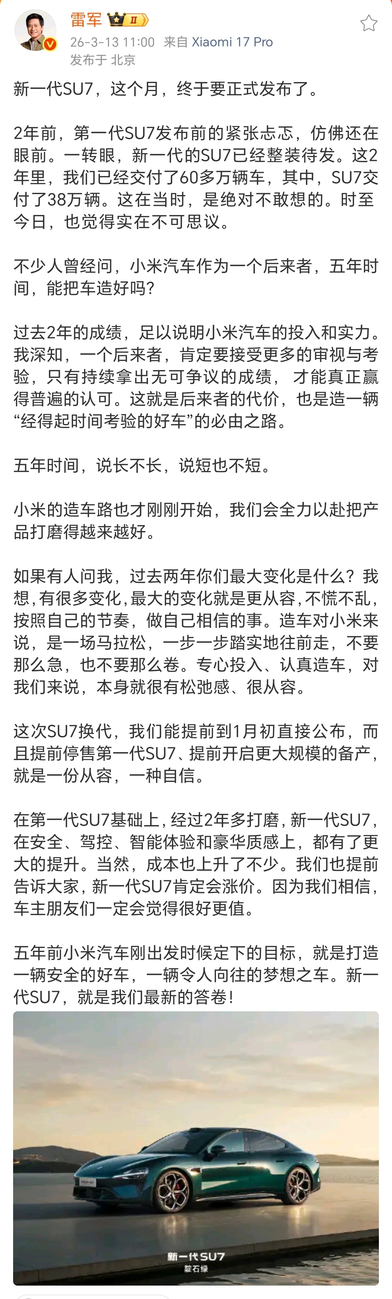 雷军称新SU7是造车5年最新答卷上午有刷到雷总微博,新一代SU7本月见。上市两年