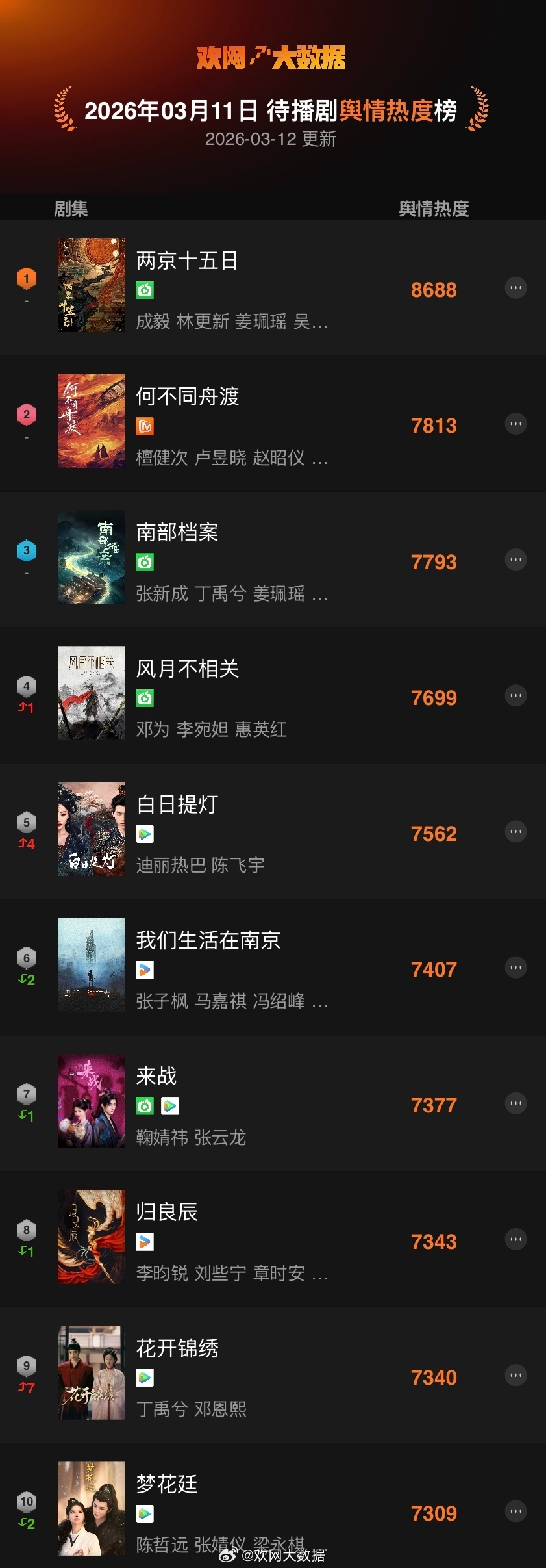 欢网大数据待播剧舆情热度榜:成毅两京十五日登顶!
