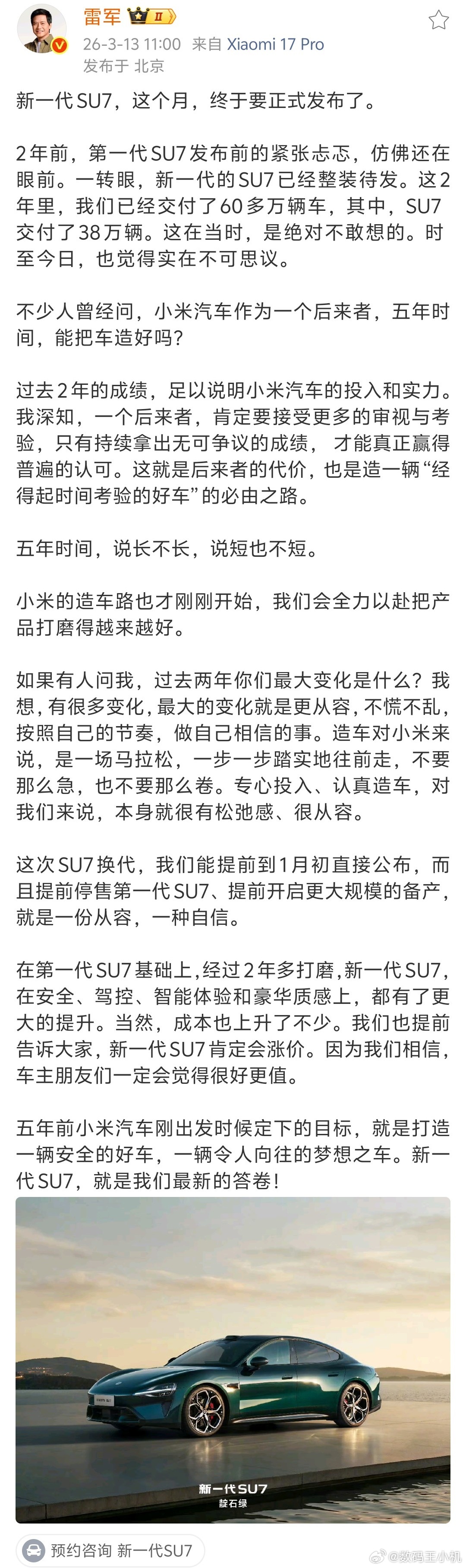 雷军称新SU7是造车5年最新答卷家人们,雷总携SU7交上了造车5年的最新答卷,名场面一个接一个,可以说让人直呼过瘾,曾经那些调侃,如今变成军儿收手吧,让BBAT缓口气,这反差太绝了,SU7直接从突围者变成了守门员,把友商打得合体。