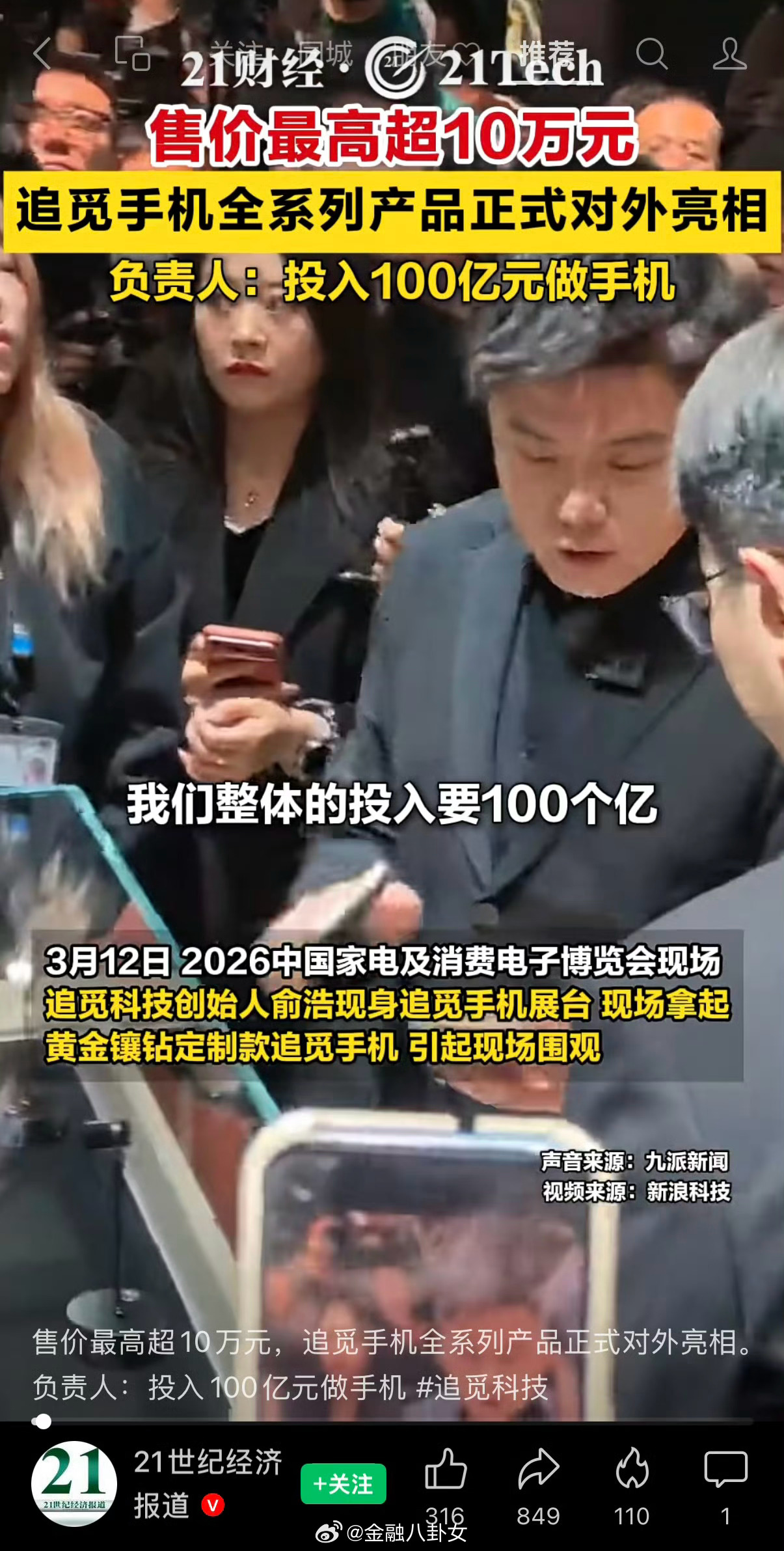投100亿元做手机,追觅手机售价最高超10万元