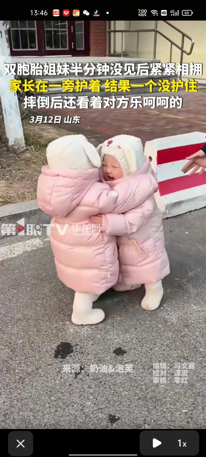 3月12日,山东青岛。网友发视频表示,一岁半的双胞胎姐妹在玩捉迷藏,仅半分钟没见就激动地抱在一起,家长在一旁护着结果没护住,摔倒后还看着对方乐呵呵的,画面温馨又治愈。