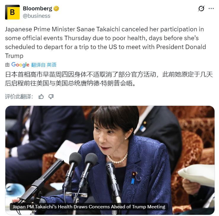 彭博社:日本高市早苗周四因身体不适取消了部分活动,此前她原定于几天后启程前往美国与特朗普会晤。 恰好这个时候生病了!你猜它还去不去探望目前焦头烂额的特朗普............