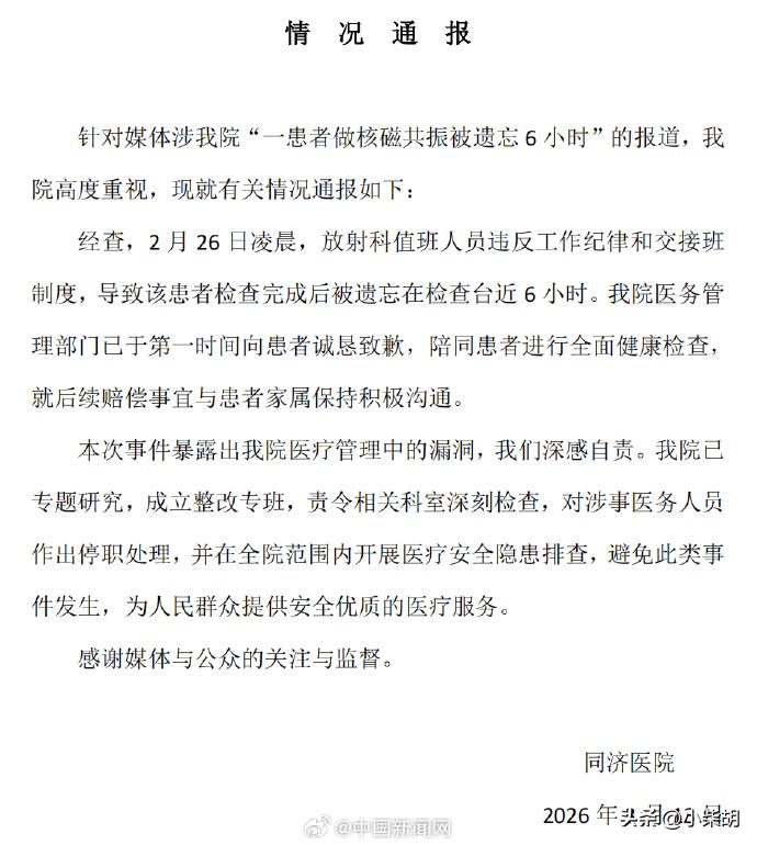 太离谱了! 真的不敢相信! 这事竟然能发生在鼎鼎大名的同济医院!把一名患者,遗忘在核磁共振室里,长达6个小时!我就想问问,问题到底出来了哪?医生不知道,家属难道也不找吗?还是住院的,陪他检查的护工呢?我猜测,大概率可能是晚上,因为6个小时,没发现说明,这6个小时,肯定是没有第二个人做核磁。不然也肯定发现了!大家伙们,你们说这事离不离谱!