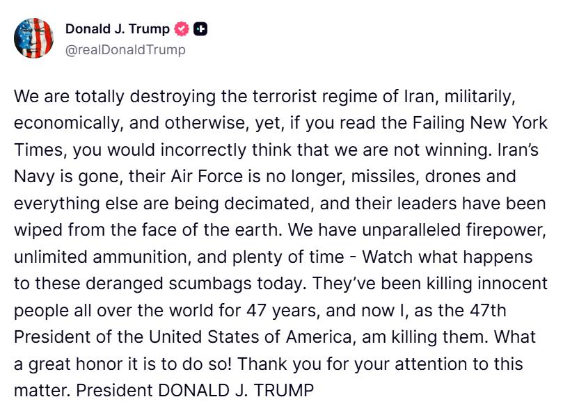从特朗普才发布的帖文看,他显然非常愤怒,而且语无伦次。 但他不会承认失败,因为他未来还要中期选举。 预计有两个可能: 1:特朗普宣布“胜利”,狼狈收兵。 2:特朗普继续赌博,不顾一切袭击伊朗,但损失也更为惨重。 顺便说一句:综合内塔尼亚胡与特朗普此前与现在的言论对比,明显感觉失败了。
