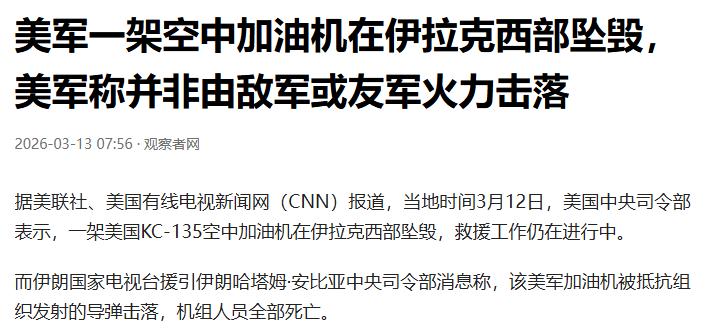 看嘛,这就是美国媒体的宣传报道方式。 伊朗称击落美加油机 机组人员均死亡 自家的飞机掉了,不是被友军击落的,就是自然坠落的,反正不是敌军击落的。 我是美国,所以,优势在我。 伊朗说是他们击落的,美国人肯定会坚持说这是假新闻。 但是我们知道,美国人的话才是假新闻。 不管怎么样,现在是美国的飞机掉了。 而且还会继续掉。 继续下去的话,真的优势还在你们吗? 点右上角关注我,我们一起去看这个魔幻的世界