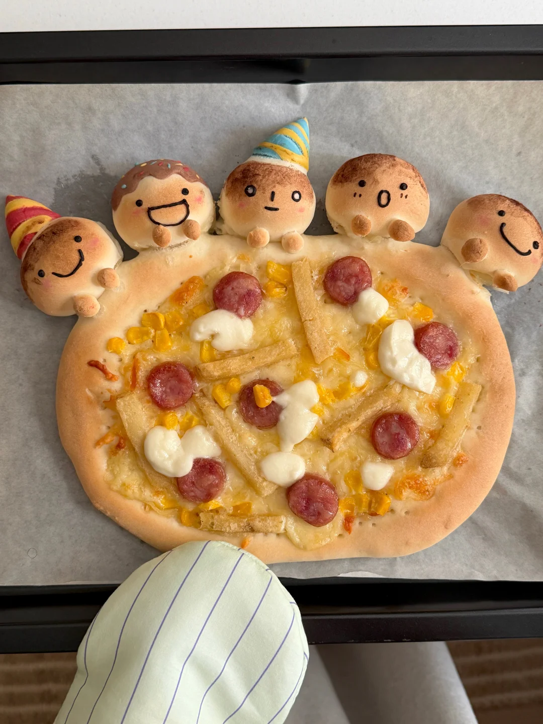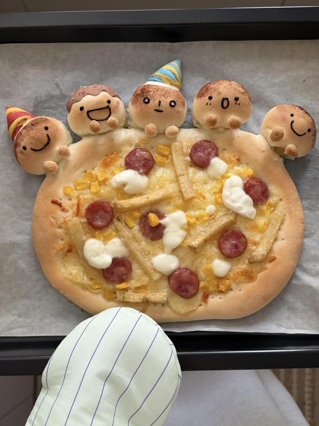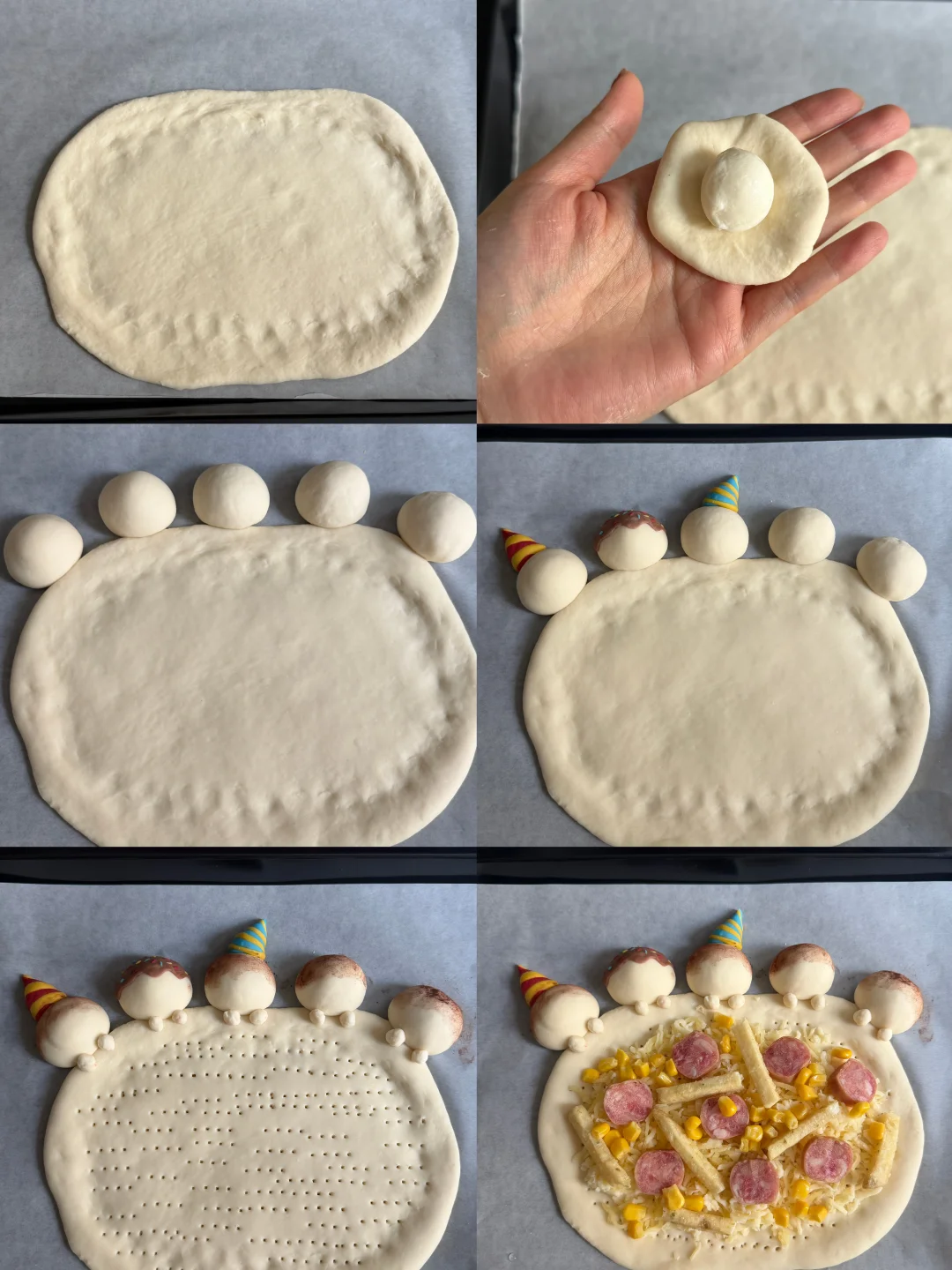 6️⃣披萨饼底用叉子插孔,铺上马苏里拉芝士碎,香肠,薯条等等自己喜欢的食材。