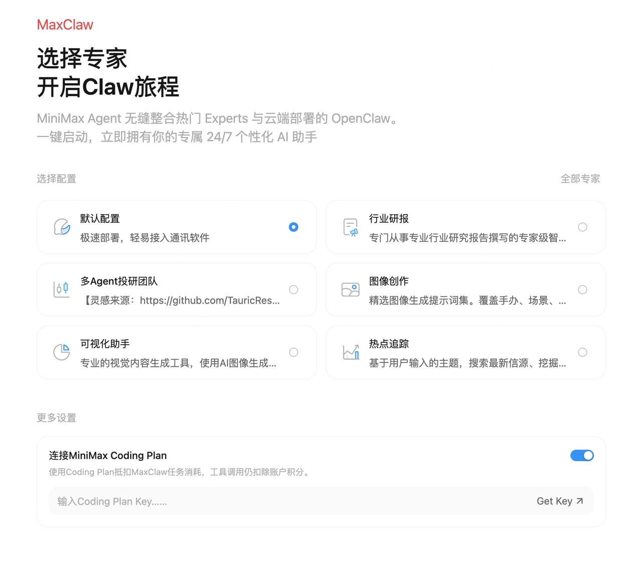 39元起步,MiniMax推出MaxClaw:AI助手走进"平价时代" 最近一段时间,OpenClaw这个开源项目在全球范围内爆红——它让普通人第一次体验到了拥有一个"个人AI管家"是什么感觉。但本地部署的高门槛,让大量用户望而却步。 于是,各大AI公司纷纷推出了自己的云端托管方案。推出各种【xxClaw】试图在这场大战中分得一杯羹。 其中MiniMax推出的MaxClaw以39元就能体验在云端部署openclaw的优势脱颖而出。 39元能用到什么?简单来说,MaxClaw把过去需要技术团队才能搭建的AI智能体,变成了一个人人可用的云端服务。 1. 一键云端部署 OpenClaw作为一个开源的AI助手框架,此前的使用门槛并不低——用户通常需要自备服务器、配置API Key、处理各种环境依赖。而MaxClaw将这些技术环节全部打包,用户只需在MiniMax Agent中点击启用,即可在云端运行自己的AI助手,无需任何技术背景。由于是在云端运行,MaxClaw能7天24小时在云端持续工作,即便关闭电脑或退出应用也不受影响。配合50GB的专属云储存空间,MaxClaw可以长期积累和记忆用户的工作上下文,越用越懂你。 2. 开箱即用的专家级Skill MaxClaw预置了多个经过调优的专业技能模块,包括"爆款猎手"(帮你追踪热门内容趋势)、"多Agent投研团队"(模拟多角色协同进行投资研究)、"热点追踪"(实时监测行业动态)等。 这些Skill不是简单的提示词模板,而是完整的工作流方案,打开就能用。 据了解,MaxClaw即将支持调用超过1.6万个专家Skills,用户还可以根据自身需求自定义专属专家。 3. 基础能力搭载极强模型 MaxClaw搭载了MiniMax最新的M2.5模型,内置联网搜索、图片生成、视频生成、文件读写等全能工具链。值得强调的是,这些工具的调用不产生额外API费用,全部包含在会员权益内。同时支持Coding Plan计费模式,为有更高用量需求的开发者和团队提供弹性选择。 4. 打通IM软件,多端协作同步 MaxClaw已经打通了飞书、钉钉、企业微信等国内主流即时通讯工具,支持跨端消息推送和协作。无论你习惯用哪个办公平台,无不管你是在用移动端,还是网页端,MaxClaw都可以将的工作成果无缝同步过来。 5. 多模态领域能力出色 MaxClaw还集成了MiniMax在支持语音定制和音乐创作能力,让你的小龙虾多才多艺,进一步拓宽了AI助手的应用边界。 回到价格本身。39元基础会员的定价策略,显然是MiniMax面向大众市场的一次主动出击。在竞品普遍定价超百元的背景下,这个价格有机会让更多用户真正跨过"试一试"的门槛。 有兴趣的读者可以在MiniMax Agent的网页端或移动端直接体验MaxClaw 网页端: 移动端:应用商店下载MiniMax Agent app