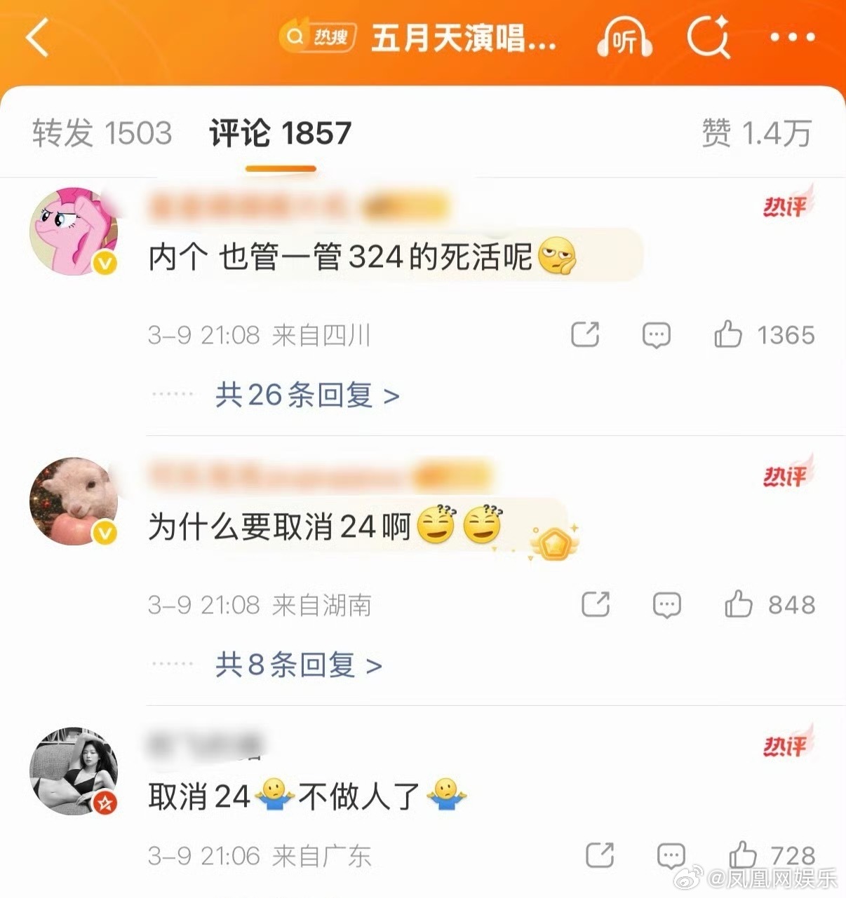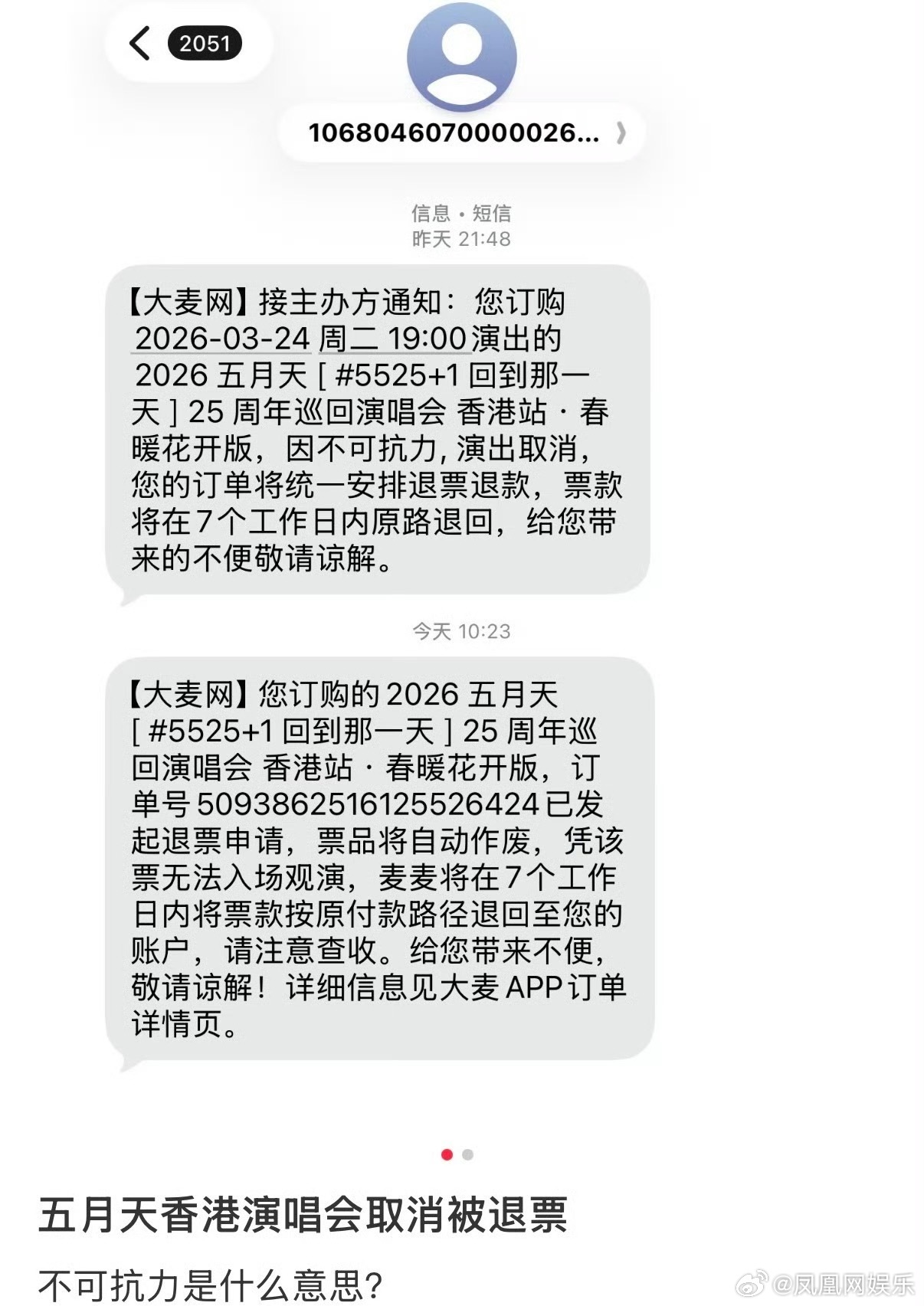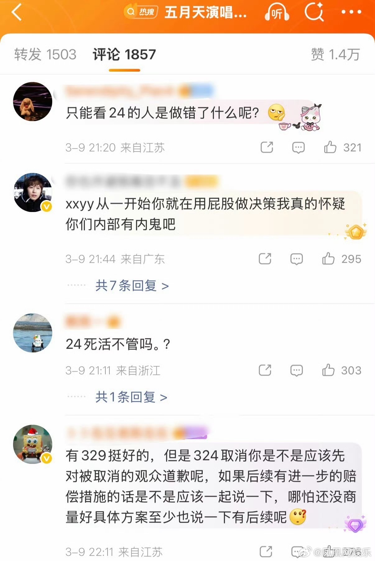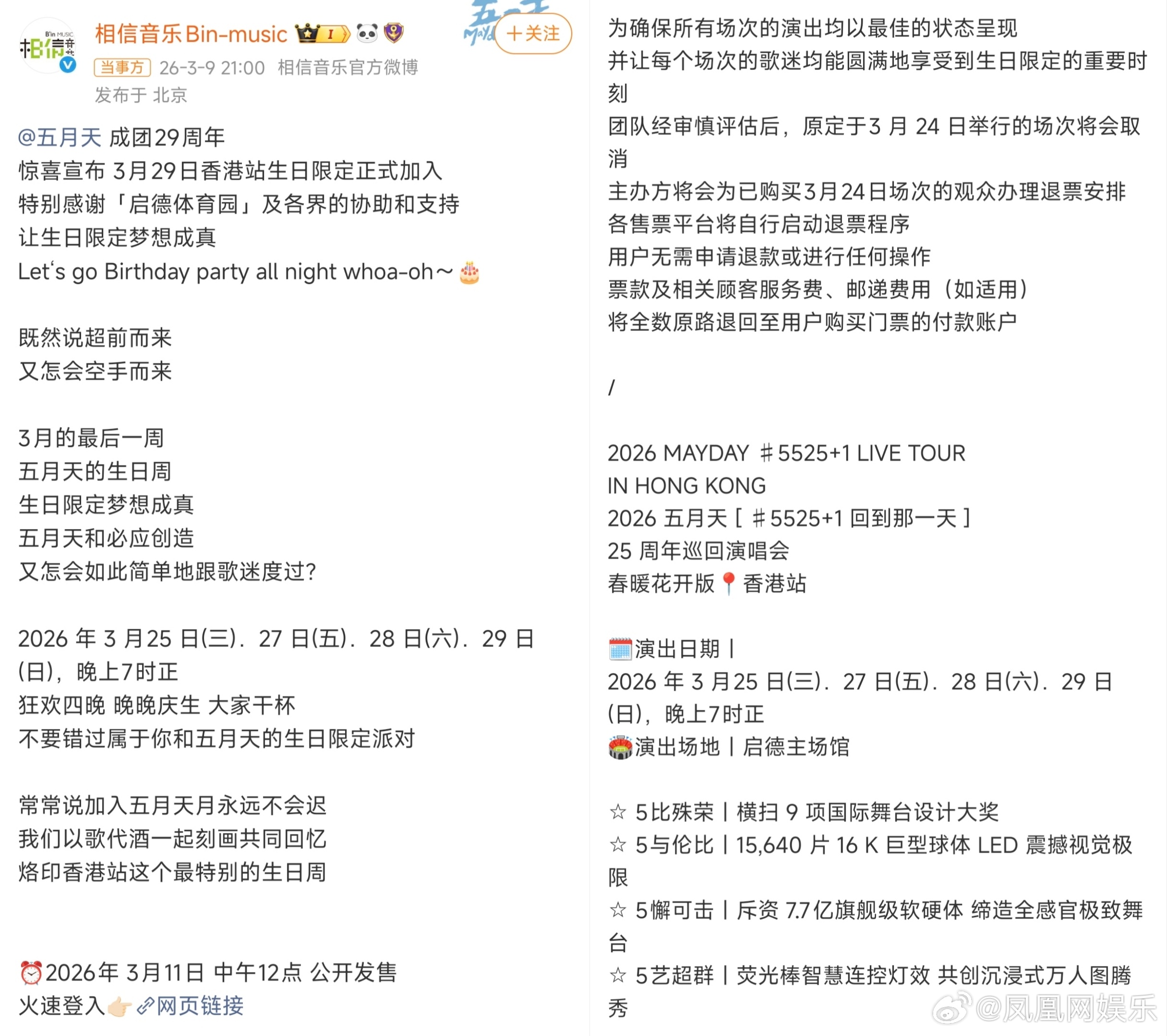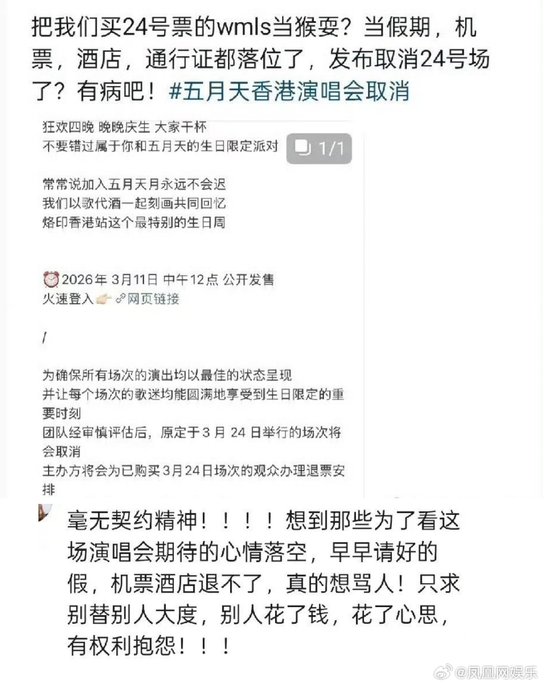 五月天香港演唱会风波近日,五月天原定3月24日在香港举行的演唱会突然取消,并宣布于本月29日加开生日特别场,引起部分购买当日门票的歌迷的不满与质疑,希望得到一定赔偿。3月11日,相信音乐官方微博发文表示,为补偿受3月24日场次取消的歌迷,将特别筹备40分钟的免费彩排特别场,有参加者或没参加者均可获得门票全数退款,但仍有歌迷表示此举仍然没有弥补他们造成的损失。