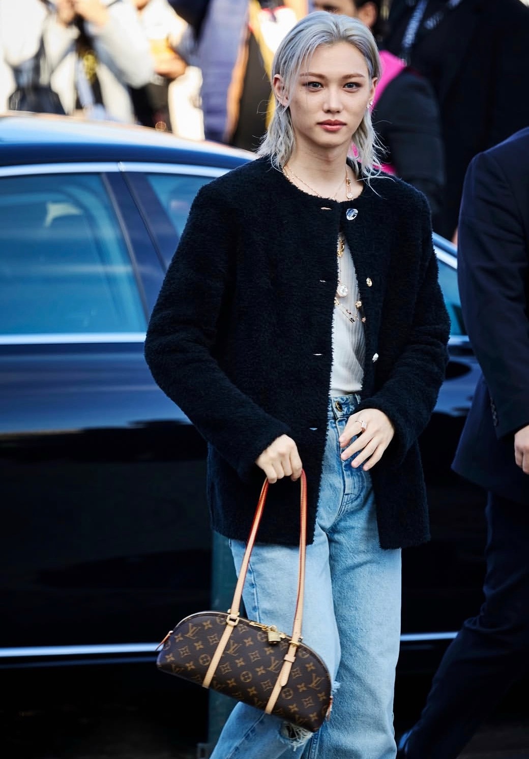 全新 Squire 长柄手袋频繁出现在秀场与明星街拍里——修长的 East West 轮廓搭配细长手柄,线条干净利落,自带一种复古而优雅的气息。