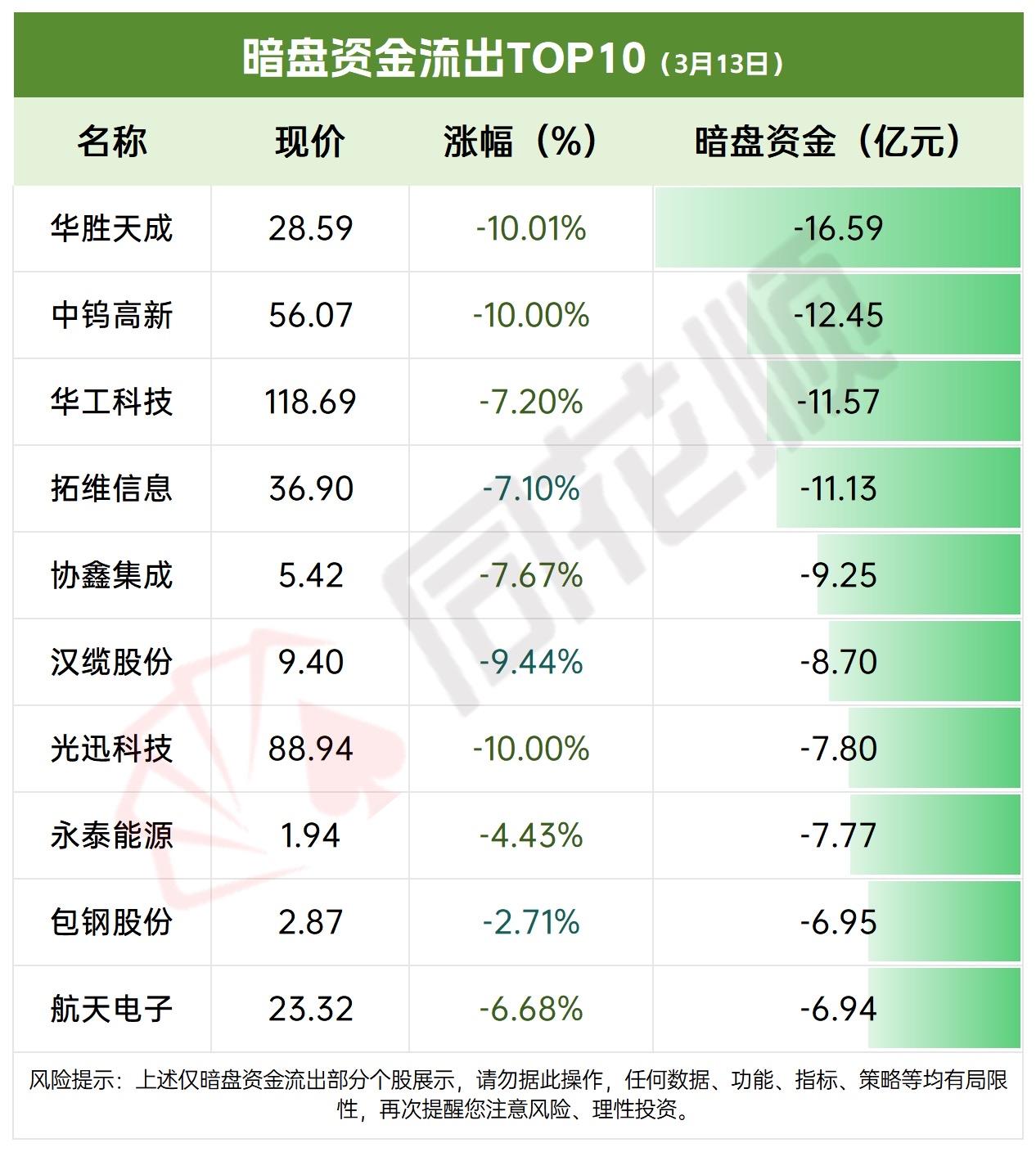 3月13日暗盘资金净流出与净流入TOP10揭晓!哪些股票受影响? 3月13日暗盘资金的流向可太有看头了。中午收盘和收盘时,主力资金大幅流出的股票不少。像华工科技,中午净流入 -8.25 亿,收盘时就变成 -20.8 亿,股价也从 119.64 元降到 118.69 元。华胜天成中午净流出 11.1 亿,收盘时扩大到 16.3 亿。紫金矿业、航天电子等也都有类似情况。这些股票受资金流出影响,股价大多有所下跌。资金流出意味着市场对它们短期信心不足,后续走势值得关注,股民们可得多留意这些动态。