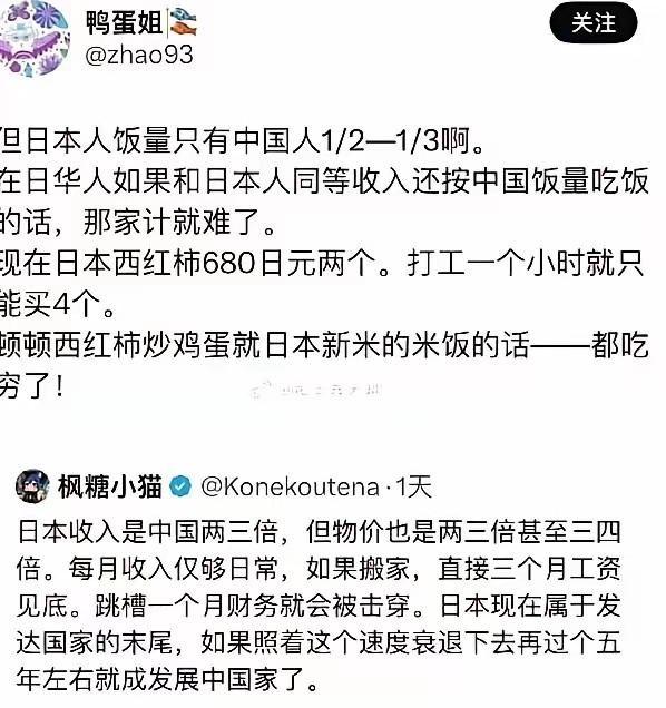 为什么说日本是穷鬼发达国家? 日本这个国家,表面上看是发达国家的典型代表,GDP总量稳居世界前列,基础设施一流,医疗教育体系也算完善。但为什么有人管它叫“穷鬼发达国家”?简单说,就是国家整体经济数据亮眼,可老百姓的实际生活水平跟不上。拿OECD数据来说,日本的相对贫困率在35个成员国里排第四位,这意味着收入低于中位数一半的人口比例不低。 发达国家里,日本的贫富差距不算最大,但底层民众的日子确实难熬。工资增长停滞多年,实际收入连续下降,2025年日本人均实际工资比前一年跌了1.3%,已经是第四年负增长。企业破产数量也创纪录,超一万家倒闭,失业压力山大。这些问题不是突然冒出来的,而是长期积累的结果,让日本在发达阵营里越来越像个吊车尾。 再聊聊物价这事儿,日本的生活成本高得离谱,尤其是东京这样的城市。食物、住房、交通样样贵。日元贬值后,进口品价格直线上升,2025年米价一度涨了67.5%,鸡蛋一盒得300日元左右。普通上班族月薪换算成人民币也就一万五,可时薪才60块,一个小时的工资买不了几斤米或几个西红柿。 相比一些发展中地区的务工者,日本人的购买力弱爆了。中国农民工月入三千,一个小时能买五斤大米或几斤鸡蛋,全家吃得敞开。可日本呢,一家三口顿顿简单饭菜都得省着点。流通成本高、税费多,加上依赖进口,导致基本生活品变奢侈。年轻人租房月租上万,挤占其他开支,老年人养老金固定,面对涨价只能缩减。整体上看,日本的经济规模大,但分配不均,底层开支超支常见。 人口老龄化是日本经济的大麻烦。2020年代,日本劳动力短缺越来越严重,老人多年轻人少。女性寿命长,高龄独居女性成贫困主力,她们多是家庭主妇,丈夫去世后只靠国民养老金过日子。日元弱、物价涨,让她们日子更苦。年轻人里,不少追求自由,没固定工作,宅家啃老或打零工,容易陷贫困。 单亲妈妈也难,带孩子兼职,收入低,贫困率高。OECD数据显示,日本劳动力参与率63%,但人口负增长拉低整体产出。企业缺人,却不愿大量接纳移民,文化封闭排外,外来劳动力难融入。结果呢,经济活力不足,创新慢,传统制造业竞争力下滑。韩国和中国追上来,日本的缓冲垫越来越薄。 日本的债务问题也拖后腿。政府债务占GDP比例高达258%,全球最高。这限制了政策空间,想刺激经济都难。产业转型迟缓,制造业面临激烈竞争,汽车电子等老本行被新兴市场抢份额。日元贬值帮了出口企业,可老百姓遭罪,进口食品能源涨价,生活成本飙升。外国游客觉得日本便宜,蜂拥而至,可本地人钱包瘪了。 2026年GDP增长预期民间只给0.8%,官方调高到1.3%,但分歧大。企业利润高,工资却不涨,加班文化盛行,社畜遍地。结果,社会活力低,数字化落后,许多领域还用传真机。相比美国或欧洲,日本的平均工资低一大截,三十年前还能比肩,现在差距拉大。 历史原因得从泡沫经济破灭说起。1980年代,日本经济高速增长,地价股价疯涨,大家觉得发达稳了。可1990年代初泡沫崩盘,银行坏账堆积,经济陷入长期停滞,叫“失去的三十年”。当局处理不当,结构性改革拖沓,导致债务累积,工资冻结。 明治维新后,日本走国家主义路子,集体利益优先,个人创新受限。公司终身雇佣制一度管用,但现在成包袱,官僚僵化,拒绝变革。战后靠出口起家,可全球化后,邻国崛起,日本人口红利没了。社会保守封闭,英语非母语,吸引不了国际人才。结果,曾经的风光不再,沦为“一代拳王”,竞争力流失。