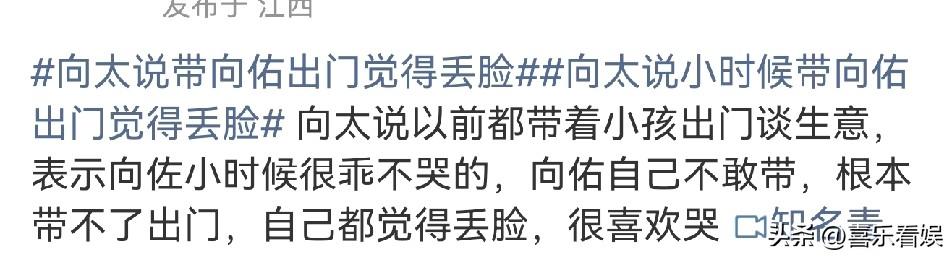 向太,公开吐槽小儿子向佑! 3月13日,向太突然冲上了热搜,原因是她在直播时,公开吐槽了小儿子向佑的一番话,引起了网友的热议。 直播时,向太聊到了孩子和事业那个重要。 向太表示这两个都很重要,她谈起了早年向佐向佑小的时候,她出去谈生意,都会带着兄弟俩。 不过,紧接着,向太又说:向佐小时候特别的乖,跟她出门就乖乖的坐在一边,不吵不闹。 而向佑则是相反,爱哭爱闹。 向太吐槽说:根本不敢带向佑出门,带出出去一哭都觉得丢脸。 向太的这番话,引来了不少的热议,有网友觉得她这样成天对着镜头吐槽自己儿子这不好那不好的,自己儿子再不好 也不应该摆台面上说 ! 说起来,这已经不是向太第一次吐槽小儿子向佑了,此前还透露向佑不满遗产的分配,跟他们夫妻俩闹,向太还因此拉黑了向佑。 就连向华强不久前,也吐槽向佑交的都是“猪朋狗友”。