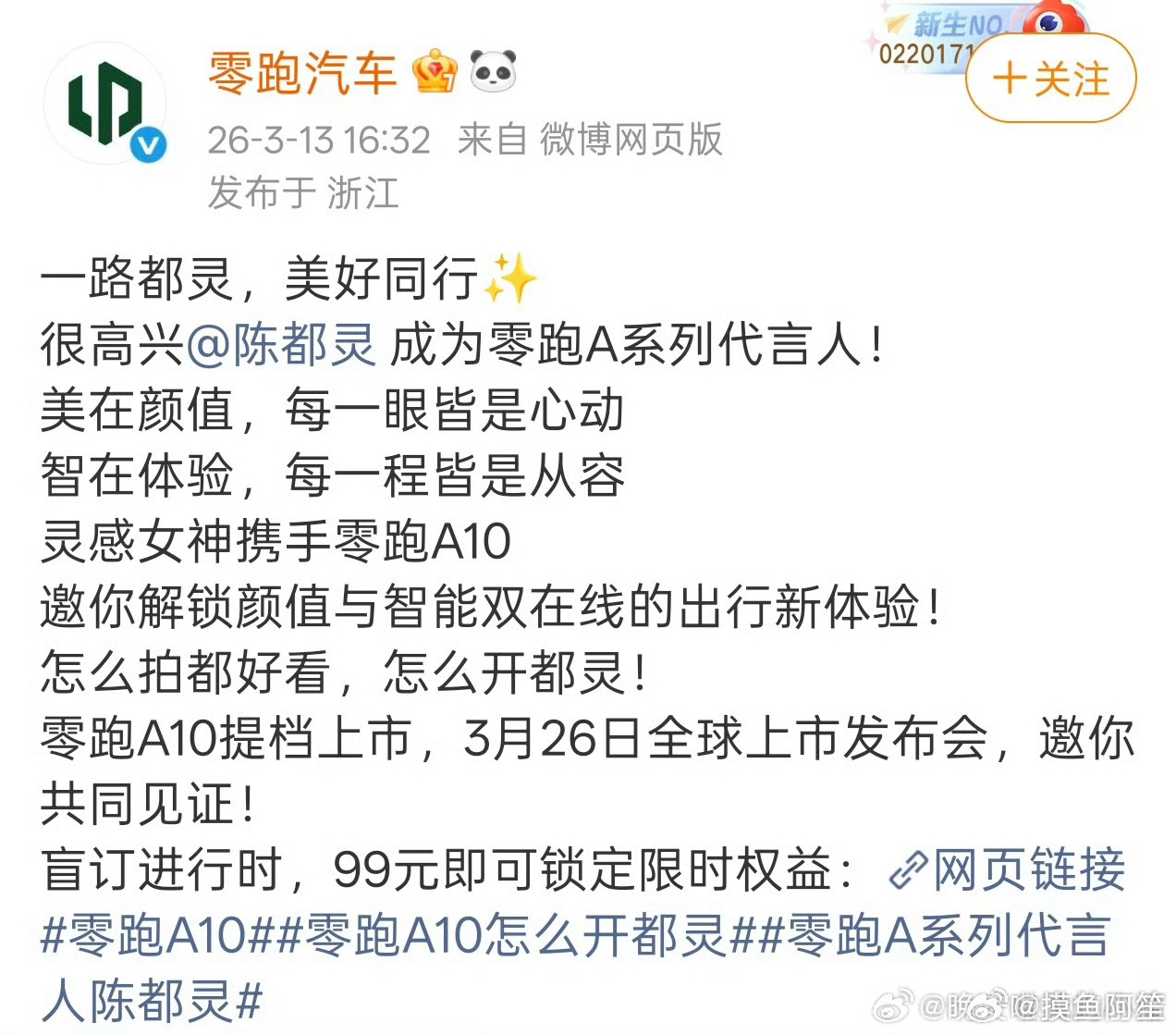陈都灵官宣零跑A系列代言人,恭喜嘟嘟🎉