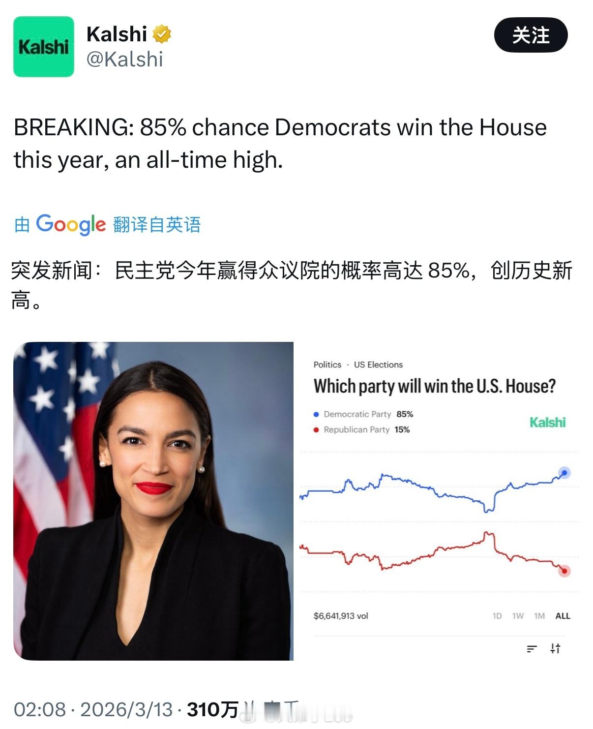 老美著名两大投注网之一的Kalshi表示,民主党年底夺回众议院的概率高达85%美