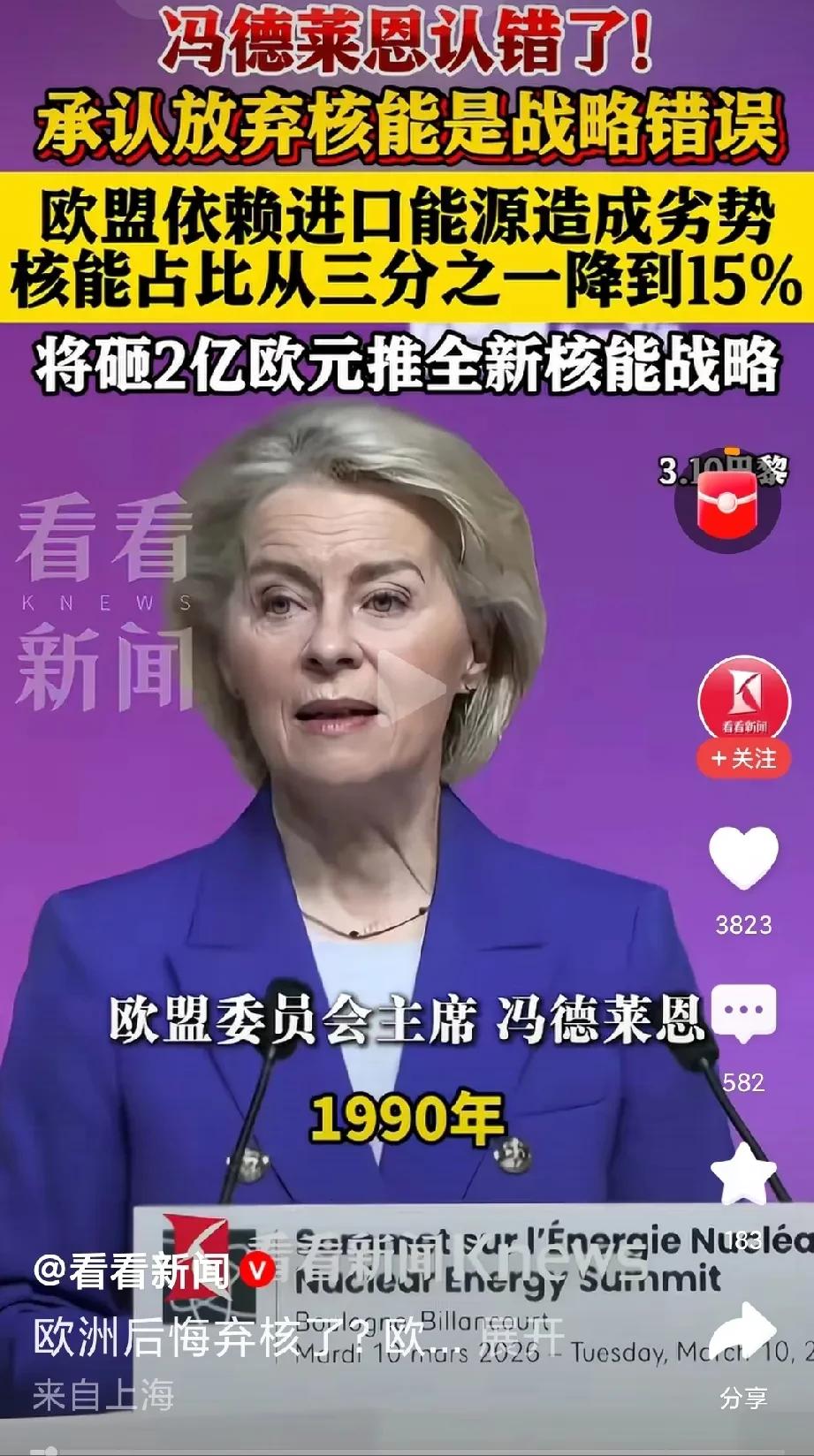 冯德莱恩道歉了!欧盟宣布砸2亿欧元重建核能! 当地时间3月10日,在巴黎举行的国际原子能机构核能峰会上,欧盟委员会主席冯德莱恩当着各国代表的面,公开承认了一个重大错误——欧洲这些年主动削减核电占比,是一个彻头彻尾的战略错误。 冯德莱恩在峰会上明确表示,1990年的时候,欧洲三分之一的电力都来自核能,可现在这个比例只剩下15%左右,这不是被动变化,而是欧洲主动选择的结果。事后看来,放弃核能这种可靠、廉价又低碳的能源,实在是失算之举。 紧接着,她就宣布了欧盟的新动作:将从碳排放交易体系的收入中,划拨2亿欧元作为担保,支持创新核技术发展,还推出了小型模块化反应堆战略,目标是在2030年代初期让这种新技术实现商业化运行,帮欧洲重建核能体系。 这番表态,结合她的过往和德国的所作所为,怎么看都透着一股说不出的黑色幽默。 冯德莱恩曾经在德国担任过高官,从2013年到2019年,她一直担任德国国防部长,是德国政坛的核心人物之一。 而最讽刺的地方就在这里,就在2024年,德国才刚刚高调宣布彻底告别核电时代,不仅关闭了国内最后三座核电站,还在去年把德国最大的贡德雷明根核电站进行了爆破拆除,两座160米高的冷却塔在几秒钟内被夷为平地。 一边是冯德莱恩作为前德国高官,见证甚至参与了德国弃核的决策;一边是她现在作为欧盟主席,公开道歉并推动欧盟砸钱重建核能,这种前后矛盾的操作,实在让人啼笑皆非。 去年德国还在为彻底弃核而庆祝,反核人士走上街头欢呼,可仅仅过了还不到一年,欧盟就急转弯,要重新捡起被德国亲手抛弃的核电,而主导这件事的,还是曾经的德国高官。 其实欧盟之所以突然转变态度,说白了就是被逼到了绝境。这些年欧洲一味追求弃核,大力发展风能、太阳能等可再生能源,可这些能源不稳定,受天气影响极大,根本满足不了工业发展的需求。 再加上近期中东局势动荡,国际油价飙升,欧洲在化石燃料上高度依赖进口,能源价格居高不下,工业竞争力越来越弱,这才意识到,放弃核能是多么不明智的选择。 可即便如此,这种急转弯也显得格外滑稽。德国去年花费大量人力物力拆除核电站,耗费的成本还没收回,现在欧盟又要砸钱建核能,相当于走了一大段弯路,最后又回到了原点。 说到底,这一切都是利益使然,欧洲所谓的环保、反核,终究抵不过能源安全和工业发展的现实需求。只是冯德莱恩的道歉,欧盟的2亿欧元投入,再对比德国去年爆破核电站的场景,怎么看都像是一场荒诞的闹剧。 曾经坚决弃核,如今全力建核;曾经的德国高官,如今带头道歉推动建核,这种种反差叠加在一起,着实构成了一场让人哭笑不得的黑色幽默。