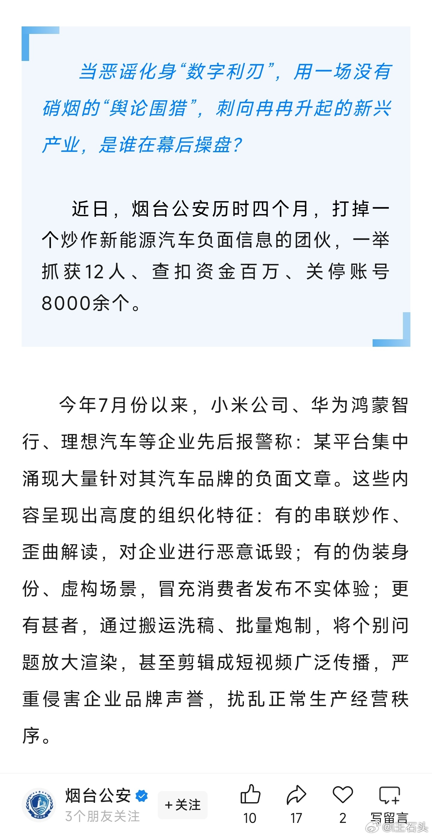 MCN通过造谣荣耀获利被警方处理 发贴称,公安机关处理了一起针对荣耀公司恶意造谣的案件。又是山东啊!三个月前,警方就打掉了一个炒作新能源汽车负面信息的团伙,抓获12人、查扣资金百万、关停账号8000余个。