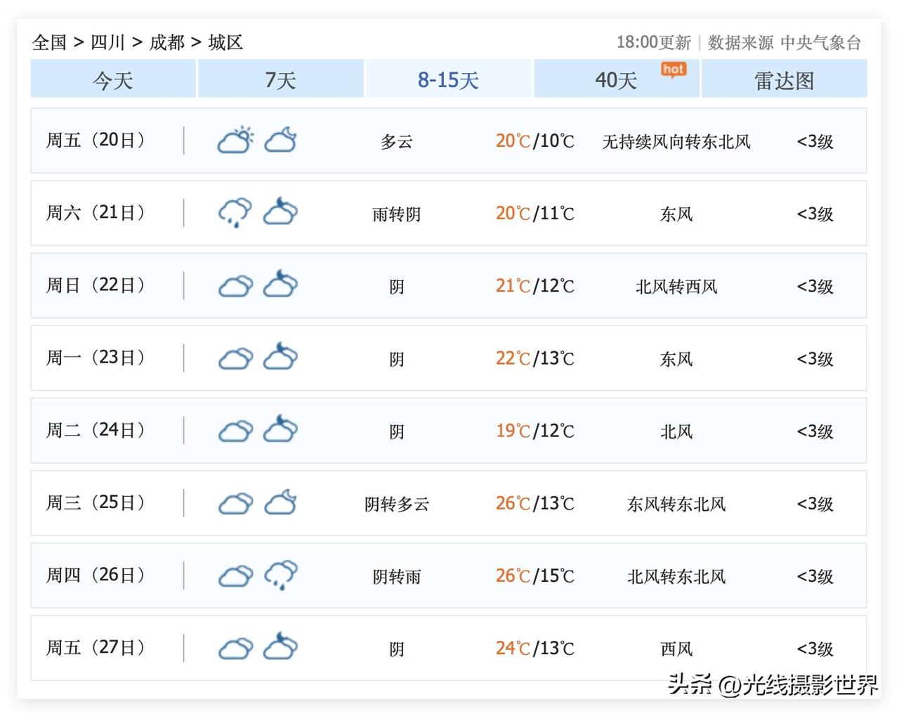应该是喜讯!3月15日,星期天,四川省成都市,多云……3月17日到20日,成都多云……看起来,接下来,成都天气预报,不错!中央气象台的天气预报,这次比较照顾成都的感觉……对比重庆的天气预报,确实有点一言难尽…… 不过,即便如此……成渝经济圈,川渝两地,成渝贵……3月13日的时候,桃花,李花,吉野樱花,基本都是到了尾声……油菜花也基本变成油菜籽……2026年春天,来的太早…… 这周末,大家赏花,可以看个尾巴……最高潮,最高峰,最旺盛,这周末要划上句号了! 成都人,川A大军……这周末……打算去哪里赏花呢?!