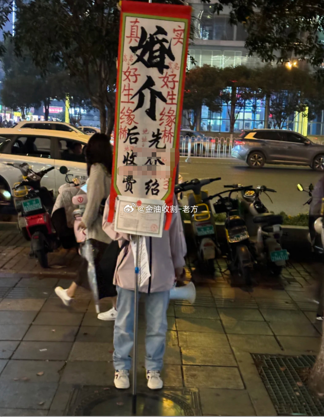 回公司路上,撞上个“行走的人形婚介广告牌”,举着大旗喊:先介绍后收费。 怎么,现在的年轻人找对象都这么卷了吗?老方作为一名80后的大好中年,是真被这小姑娘惊到了!现在的年轻人,真的太会整活了。