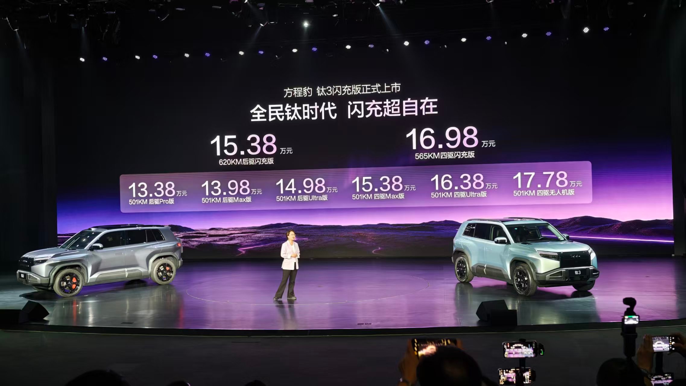 方程豹钛 3 闪充版终于也上市了! 620km 后驱版为 15.38 万元,565km 四驱版为 16.98 万元