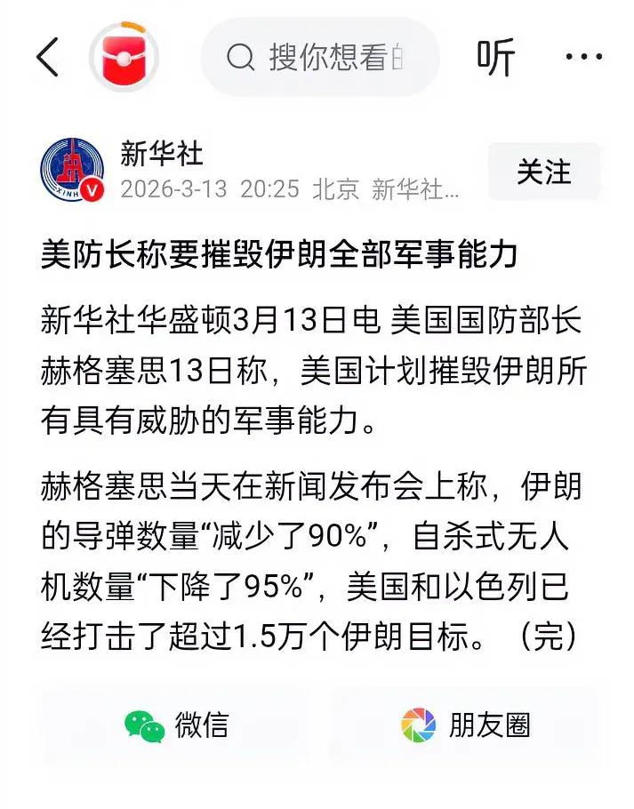 1.5万个目标,一个目标用一颗导弹,1.5万枚导弹打出去了,还有防空打的加起来应该有2万枚,可能吗? 美国防长赫格塞思,前播音员、前排长,如今指挥一众将军,张嘴就吹:伊朗导弹少90%,无人机降95%,打击1.5万目标。 真当大家不懂军事?1.5万目标就算一颗导弹打一个,再加上防空拦截,两万枚导弹从哪变出来?美军战斧库存都没这么多! 事实证明:打嘴仗老美排第二,绝对没有那个国家能排第一。[捂脸] 最大的军事能力是一个国家民族的坚忍的复仇怒火。有能力扑灭这股怒火,才算是胜利者。