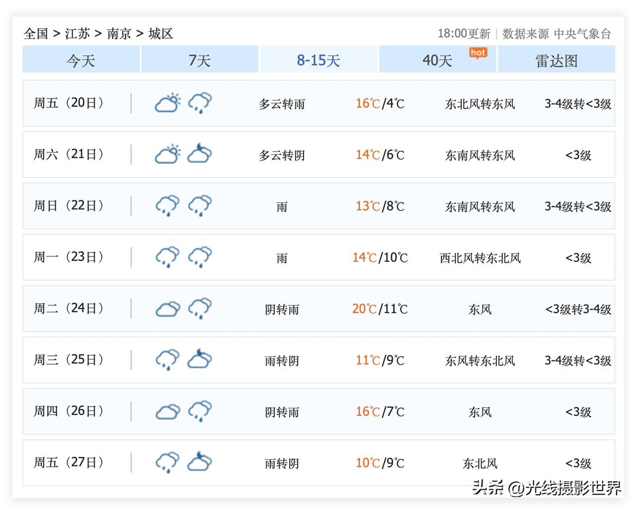 还好还好,虽然南京市即将迎来断崖式大降温的降雨,但是,3月14日,星期六,南京晴转多云,最高气温20度……星期六,大家可以去玄武湖或者前湖后湖南京植物园,踏青赏花……还好,星期六不下雨…… 不过,问题是,3月15日到18日,南京市每天都要下雨,持续阴雨连绵…… 3月16日,星期一,南京小雨转阴,气温骤降至7-11度,南京的小伙伴们,又要穿上羽绒服和秋衣秋裤了…… 3月16日到19日,南京的气温,都会比较湿冷……大家多穿点! 再然后……3月22日到27日,南京市可能还会经历一轮降雨降温……羽绒服和秋衣秋裤,可能不能扔掉……没有办法……气温不稳定,三月的天气,小孩的脸……很容易变化……