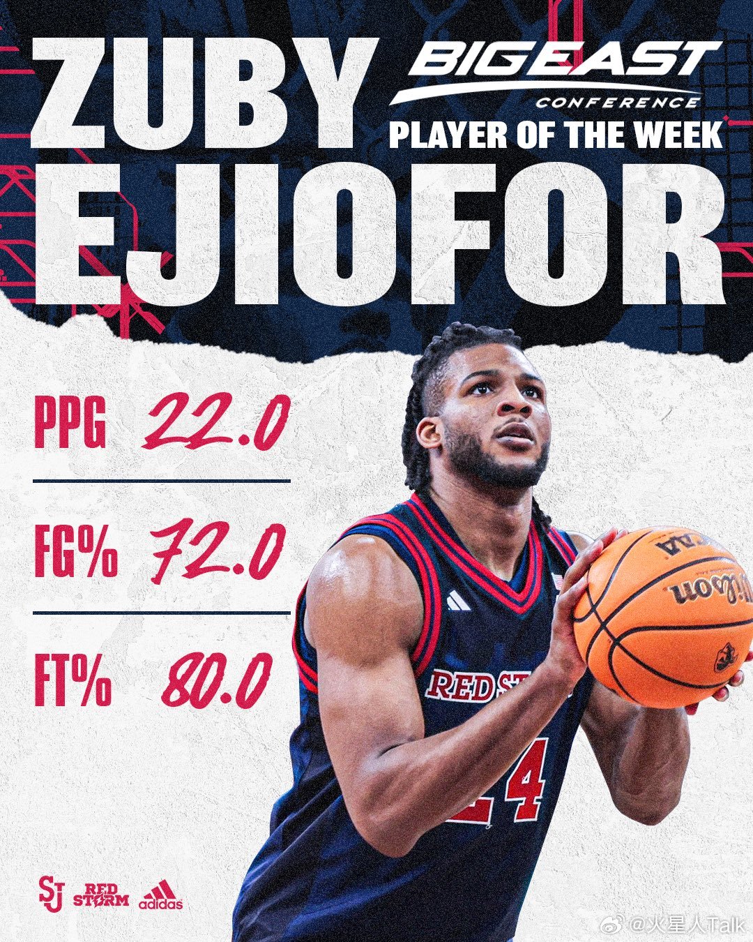 Big East联盟第18周表现奖(2025-2026赛季)。NCAA男篮最佳球员:Zuby Ejiofor,最佳新生:Nigel James Jr。
