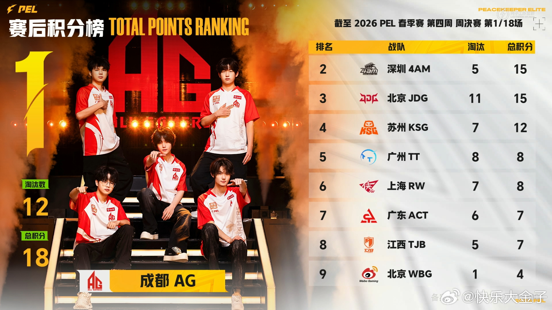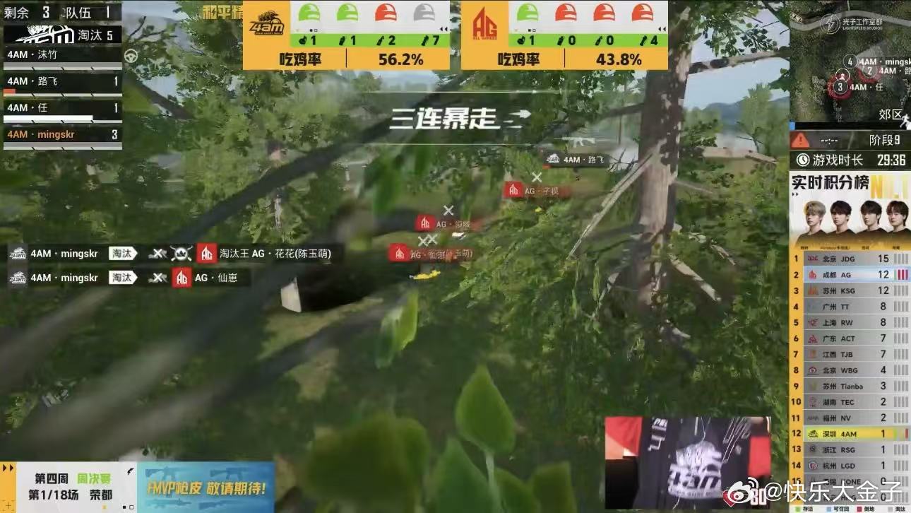 4AM荣都开门红PEL春季赛第四周周决赛 AG第一局12淘汰收获18分,虽然被4AM吃鸡,但AG凭借淘汰分数暂列第一位。和平精英职业联赛