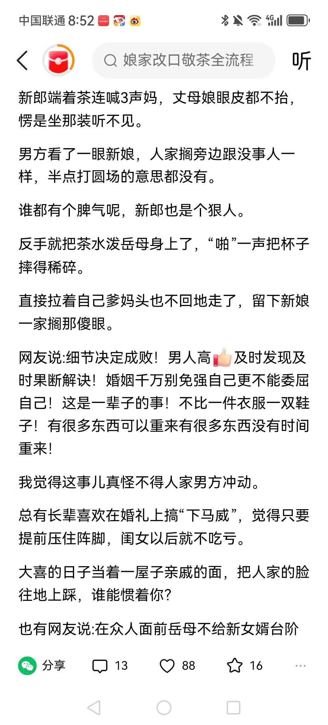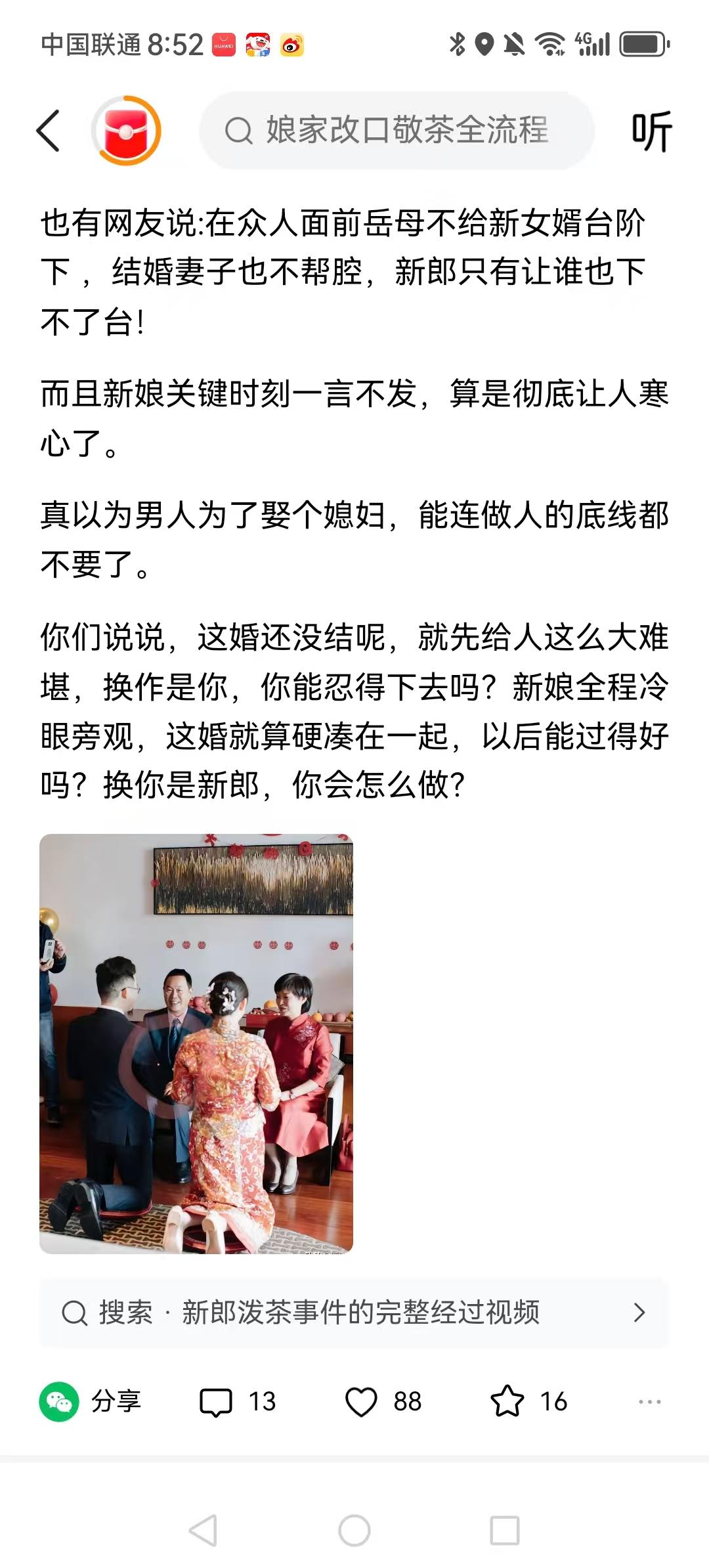 这下咱们可算是长见识了,敬个茶能把婚给敬没了。不合常理,丈母娘要为难婚礼之前就为难过了,要不就是这一家子全是傻子。 林子大了,难免有个别的混不吝的,我们理解不了,是因为我们生活中遇到的都是正常人。 这种就是在捧杀不要结婚的男士,其心可诛! 新郎也不对,你娶的是老婆又不是丈母娘,她今天为难你,以后不认丈母娘不来就是了,没必要把老婆也丢了。 岳母没有教养的样子,牛什么牛呀,你要真为你女儿好,就少难为姑爷。