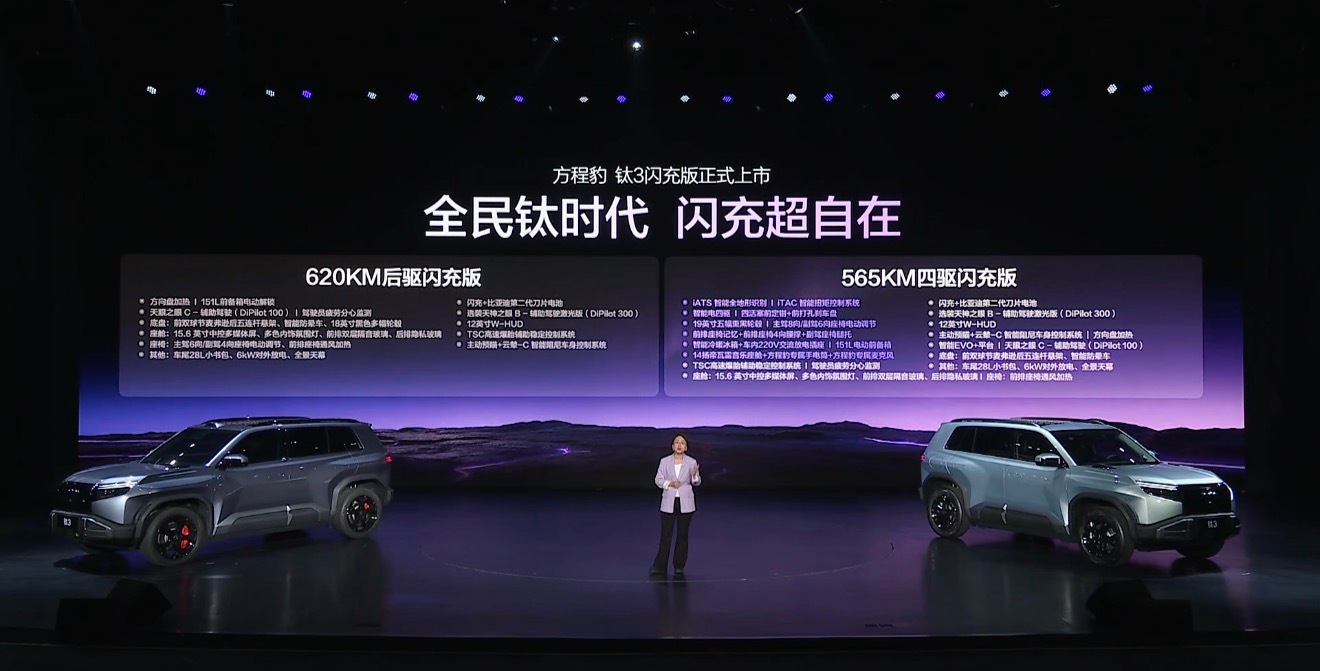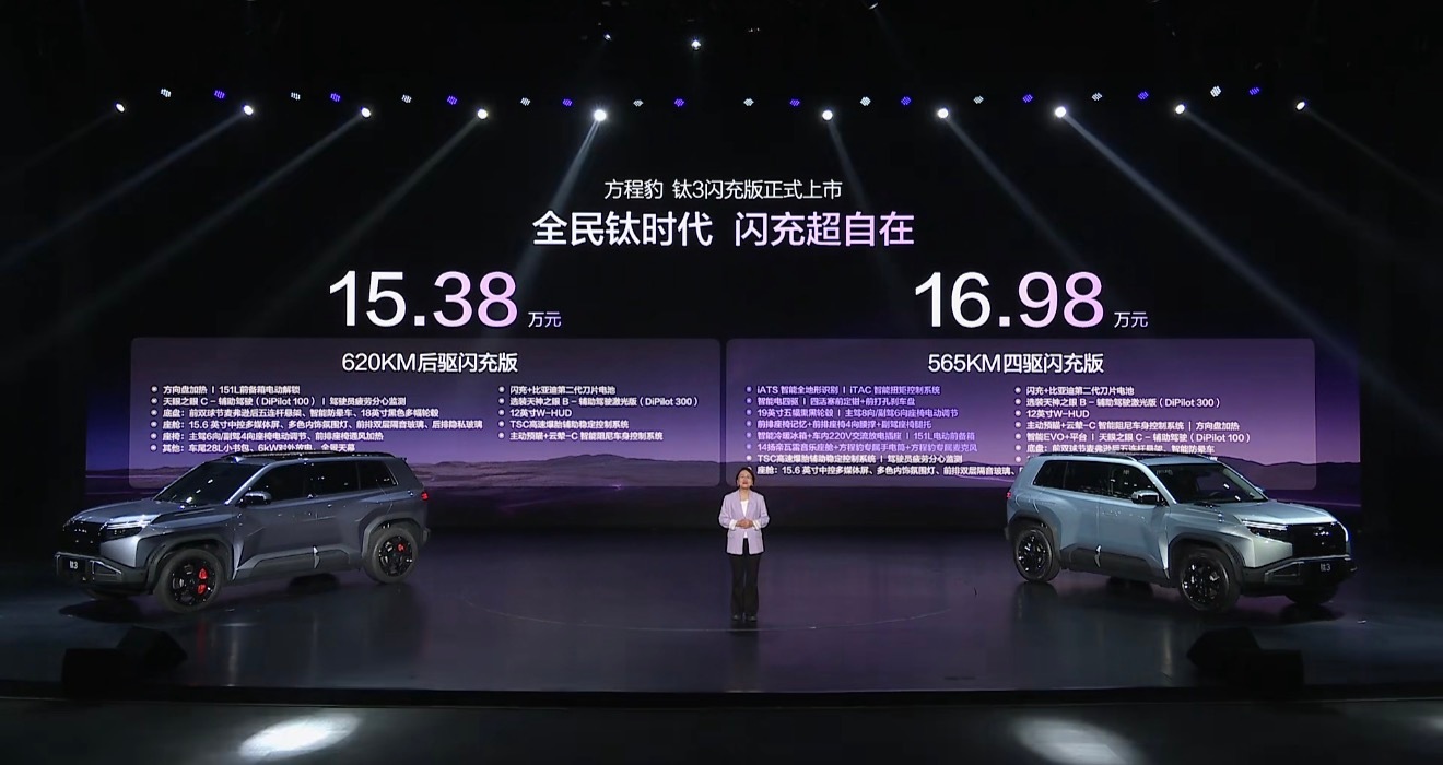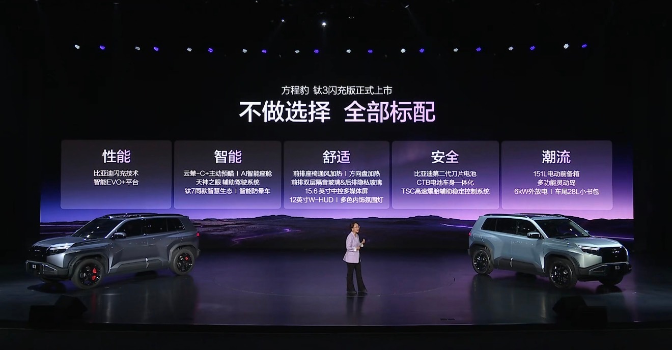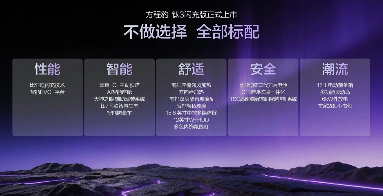 方程豹钛3闪充版价格发布,15.38万起就能拿下带闪充的硬派纯电SUV,性能、智能、舒适、安全、潮流配置全给你标配……闪充、云辇-C、天神之眼、第二代刀片电池,不用纠结选装,直接一步到位