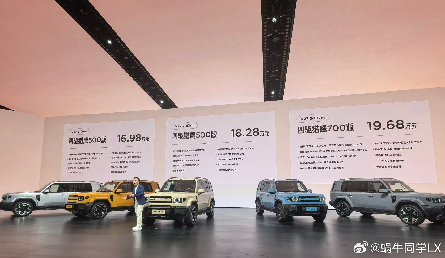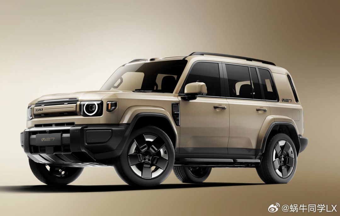 V27延续硬朗方盒子造型,车长超五米,纯电续航超 200km,综合续航 1200km+,四驱版零百加速 5.5 秒。全系标配高通 8295P 芯片,高配搭载激光雷达 + 地平线征程 6P,全场景 NOA 智驾全覆盖,搭配 MRC 磁流变悬架与四驱三把锁,越野和智驾都可得兼。