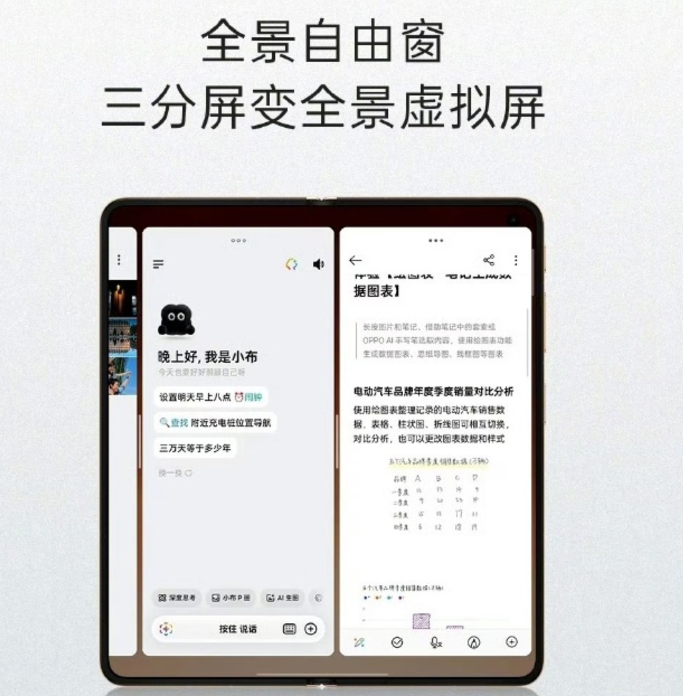 市面上的折叠屏很多,真正利用好大屏幕的却很少。这次国产折叠屏推出的N6倒是确实让人眼前一亮。为了充分利用这块几乎看不出折痕的大屏,它最多可以同时开启4个应用窗口,而且窗口的大小可以自由调节,浮窗、分屏以及全屏之间都有手势丝滑切换。并且为了进一步提升大屏体验,N6还搭配了AI手写笔,可以随手写画,那AI在哪呢?没错,直接将随手的内容生成为图、表。笔的携带也很方便,可以直接磁吸在手机侧面。顺便一提,N6还支持果系列全家桶,原生级别的互联效果,跨设备、跨系统之间无缝流转,对跨生态用户来说非常友好。