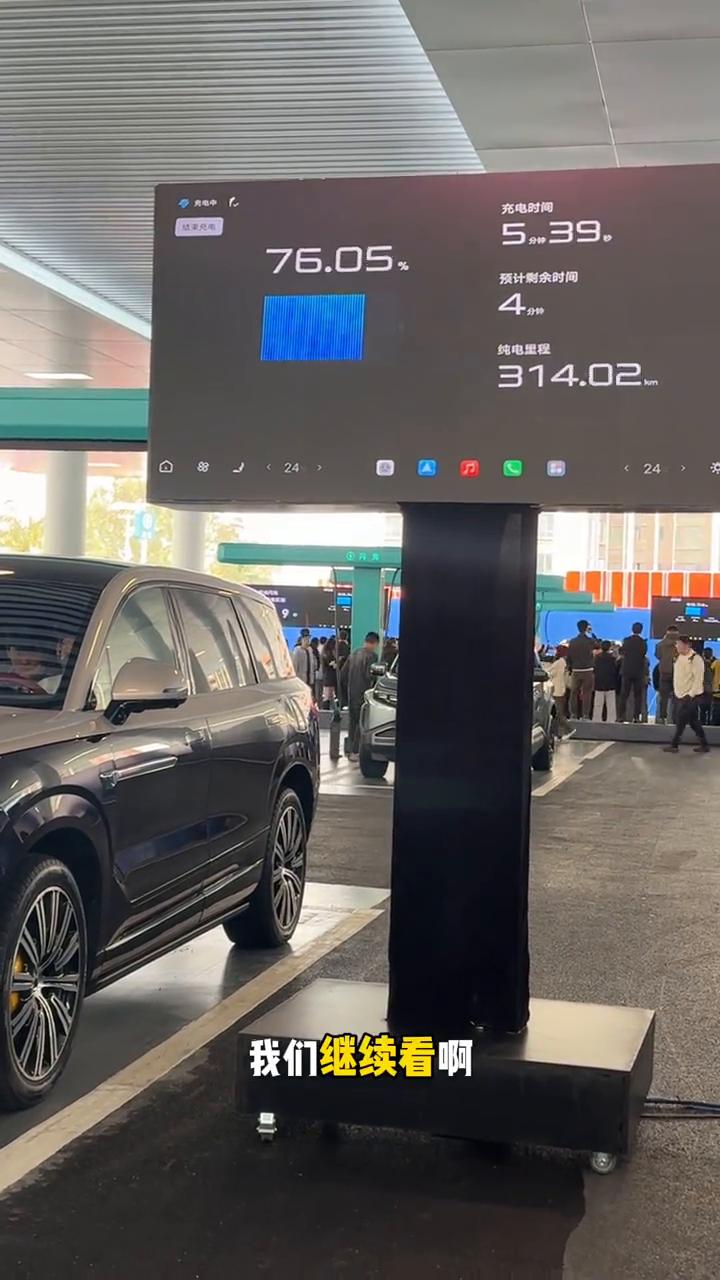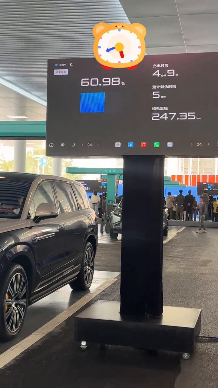 比亚迪的闪充站,5分好9分好。 来看看比亚迪的闪充站。首先它的充电线是垂直悬挂的,并且上面有一个滑轨可以左右移动。还有就是这个充电枪非常的轻,单手手持毫无压力。 然后看看腾势N8L闪充实测。充电开始了,看到充电速度非常快,视频加个速。可以看到在充电三分钟的时候电量已经充到接近50%了,在充电五分钟的时候补能已经达到70%了。继续看,在80%后速度依然很快,在9分钟的时候电量已经充饱了,达到了97%。剩下的3%是留给动能回收的空间。 这就是比亚迪闪充带来的五分好九分饱的实际体验。