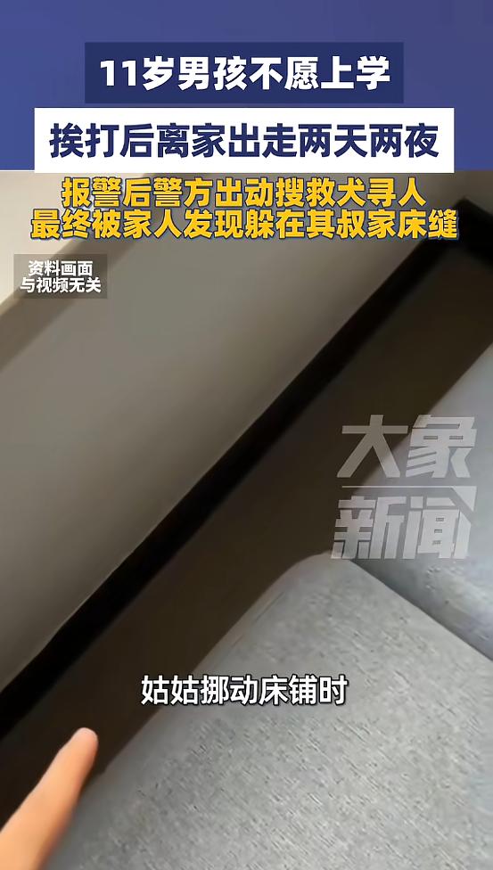 离了个大谱!近日,河南平顶山,一男孩春节沉迷手机,开学后不想上学,便了躲起来,父亲发现后情绪失控踢了他,当晚男孩便失踪,家人彻夜寻找无果后报警,还是姑姑挪动床铺时,意外发现男孩躲在床缝中!网友:还是要好好沟通!   说起最近河南平顶山发生的这件事,不少人看完都觉得又揪心又无奈,看似离谱的闹剧背后,藏着很多家庭都在面对的教育难题。   事情的主角是当地一名11岁男孩,春节假期里他一直沉迷手机,作息和心态都没调整过来,等到开学后,彻底产生了厌学情绪,说什么都不愿意去学校,甚至直接躲起来逃避上学。   孩子的父亲发现后,一时情绪失控,没能压住火气踢了孩子,本想通过这种方式让孩子认错上学,没想到反而激化了矛盾。   当天晚上,男孩就悄悄离开了家,彻底没了踪影。   家人发现孩子失踪后,瞬间慌了神,彻夜在村里村外四处寻找,家门不敢关、灯也不敢熄,就盼着孩子能自己回来,可找了一整晚,始终没有半点消息。   眼看着孩子失联时间越来越长,家人实在没了办法,第二天便赶紧报警求助。   警方接到报警后十分重视,立刻安排警力展开排查,还专门出动搜救犬帮忙搜寻,同时调取周边监控逐一分析。   监控画面显示,男孩曾出现在叔叔家附近,可家人把叔叔家的角角落落翻了个遍,里里外外找了好几轮,都没发现孩子的藏身之处,只能继续焦急等待。   就在所有人都心急如焚的时候,转机突然出现。   孩子的姑姑为了帮忙寻人,留宿在叔叔家,夜里无意间想把靠墙的床铺往外挪动一下,整理一下房间,这一挪竟意外发现,男孩正蜷缩在床铺和墙壁的窄缝里,安安静静地躲在这个不起眼的死角里,整整两天两夜没露头,也没发出一点声响。   看到孩子平安无事,家人悬着的心终于落地,孩子的父亲更是满心愧疚,直言当时不该冲动动手,只顾着发泄情绪,却忽略了孩子的内心想法。   这件事看似是孩子任性逃学、躲猫猫闹剧,实则戳中了亲子教育的核心问题,假期沉迷电子产品、开学适应困难,是很多孩子都会出现的情况,面对这种问题,暴力管教从来都不是解决办法,只会让孩子产生抵触心理,甚至用极端方式逃避问题。   不少网友看完这件事也纷纷发表看法,有网友直言“孩子不是打服的,是聊通的,遇事先稳情绪再讲道理,比啥都强”。   也有网友感慨“看着孩子蜷在床缝里,既心疼又生气,家长真得改改教育方式,多跟孩子好好沟通”。   其实孩子厌学、沉迷手机,本质上是心理和习惯出现了问题,家长越是急躁打骂,孩子越是封闭内心。   遇到这类情况,静下心来倾听孩子的想法,耐心引导化解抵触情绪,远比冲动动手更有用。   毕竟教育的初衷是引导孩子成长,而不是用暴力逼孩子妥协,别让一时的情绪失控,伤了孩子的心,也让全家陷入恐慌。   对此您有什么不同的看法,可以在评论区留言讨论!!!   信息来源:《河南,11岁男孩不愿上学,挨打后离家出走两天两夜,报警后警方出动搜救犬寻人,最终被家人发现躲在其叔家床缝》大象新闻