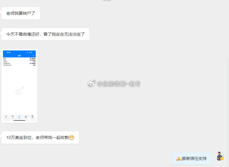 我们不自诩为行业翘楚,我们只脚踏实地。将每一次策略做到极致。让每一份利润,都种下信任的种子。炊先生的这份信任,老方我将以百倍的利润回应,最近操作和状态很给力,与忆慈女士的合作自然吸引了不少有心者,毕竟一单赚十万的神迹还历历在目,每周也保持着高频出金,前后盈利了上百万美金,银行卡里也是躺着几百万,神迹可不是谁都能拥有的!我们常说“一诺千金,一言九鼎”,诺言不只是一句话,更代表了一种责任和担当。让人放心的人,永远不会透支自己的信用,永远不会辜负别人的信任,这个人就是我。