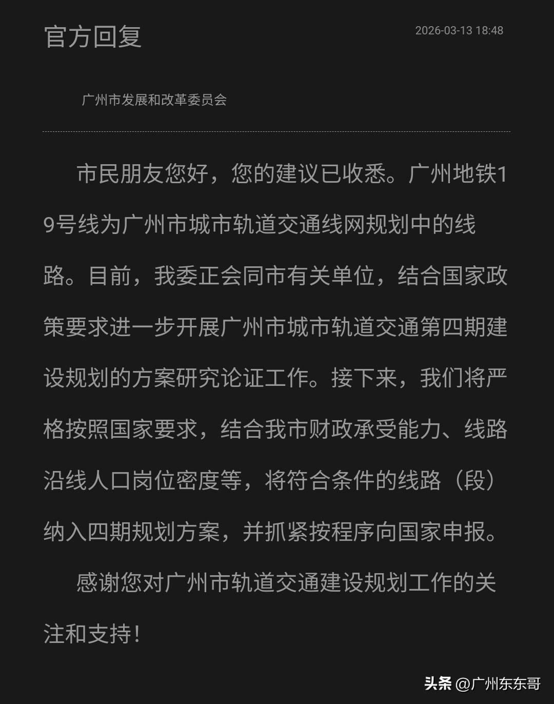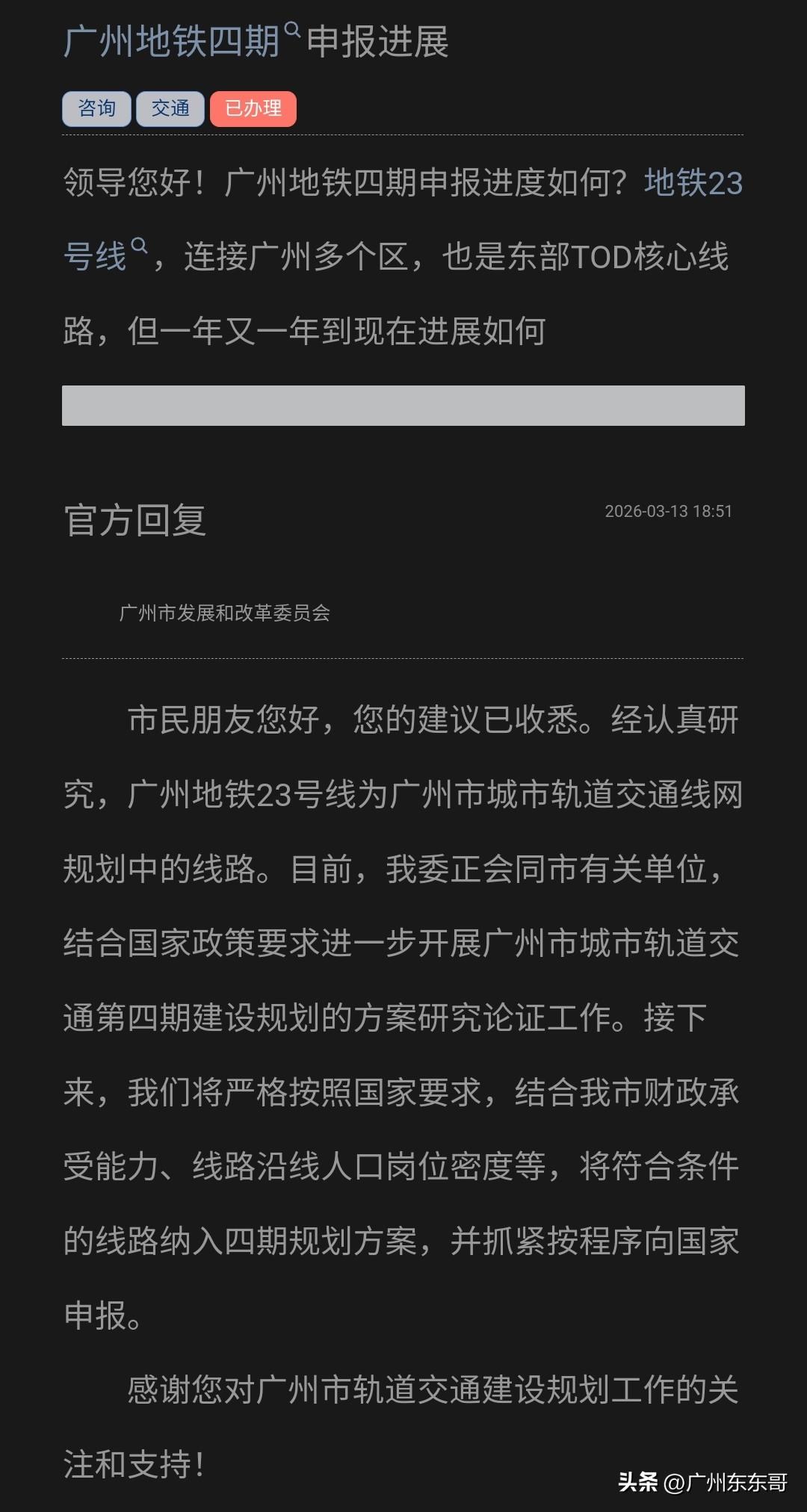 有关广州地铁四期规划线路19号线和23号线申报最新进展,官方最新回应来了! 广州市发改委的回复大致有几个意思: 严格按照政策要求,比如人口密度和岗位密度。 财政支持力度。 目前还没申报。 所以大家还得再等等吧!