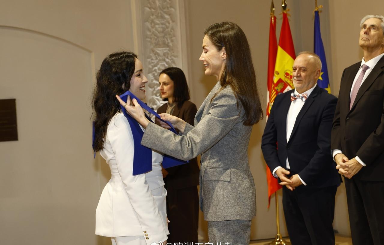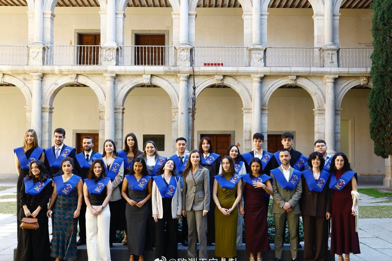 3.12 西班牙王后莱蒂齐亚出席马德里阿尔卡拉大学国际报道继续教育硕士项目的结业典礼,裤装来自zara