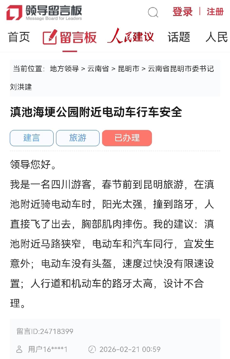 四川游客向昆明市委书记建议关注滇池海埂公园附近电动车行车安全 近日网民通过人民