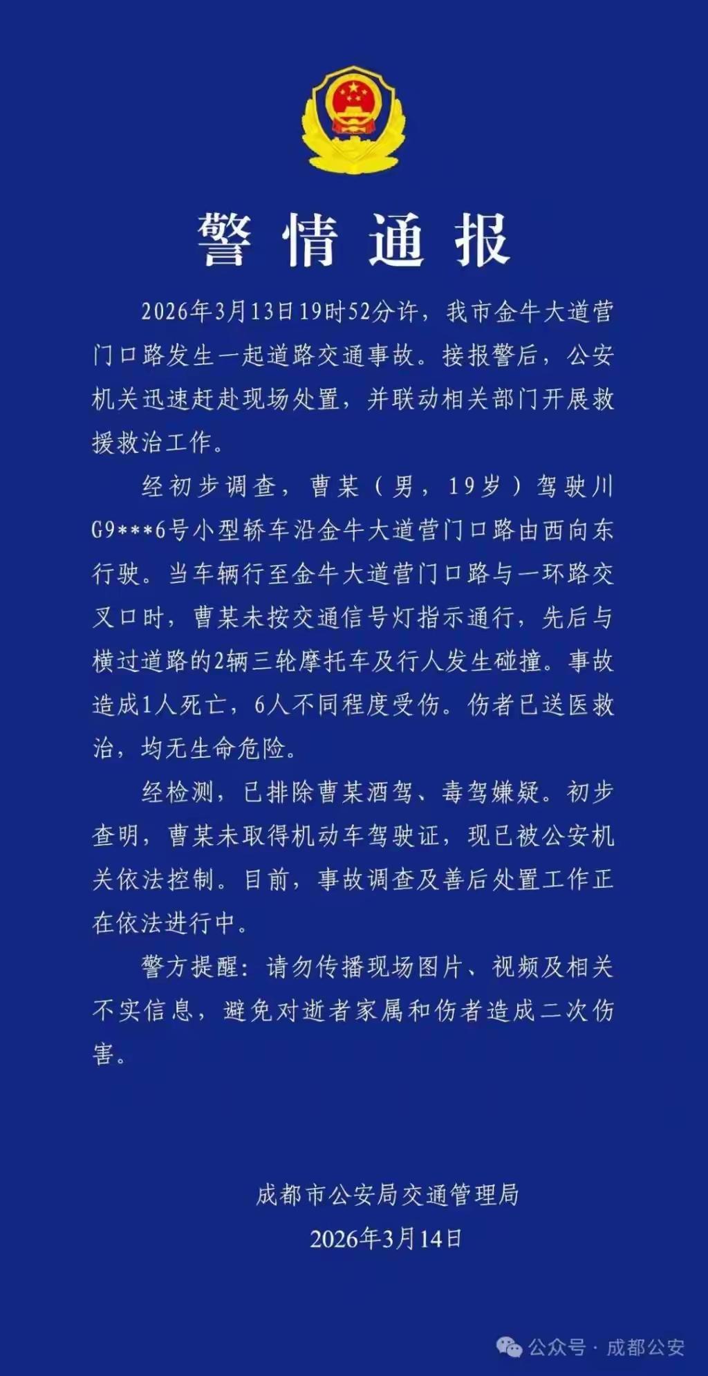 任性闯灯无证上路,一条人命六伤岂是“年轻”能抵!2026年3月13日19时52分,成都金牛大道营门口路发生一起交通事故,造成1人死亡、6人受伤。3月14日凌晨,成都交警发布警情通报,19岁无证驾驶员曹某被依法控制。 19岁,本该是敬畏生命、恪守底线的年纪,却因无证驾驶、闯红灯,一手制造出一死六伤的人间惨剧。年轻从不是践踏法律的挡箭牌,更不是伤害生命的免罪符。 无证上路是目无法纪,闯红灯是草菅人命,每一个错误叠加,都是对公共安全的极端漠视。车轮滚滚,人命关天,一次放纵的冲动,毁掉的是数个家庭的幸福。 法律不容挑衅,生命不容轻视。唯有依法顶格惩处,让肇事者付出沉重代价,才能给逝者与伤者一个交代,才能警醒所有心存侥幸者:规则是生命线,敢越雷池,必付惨痛代价。社会热点 成都金牛大道交通事故 19岁男子无证驾驶致1死6伤