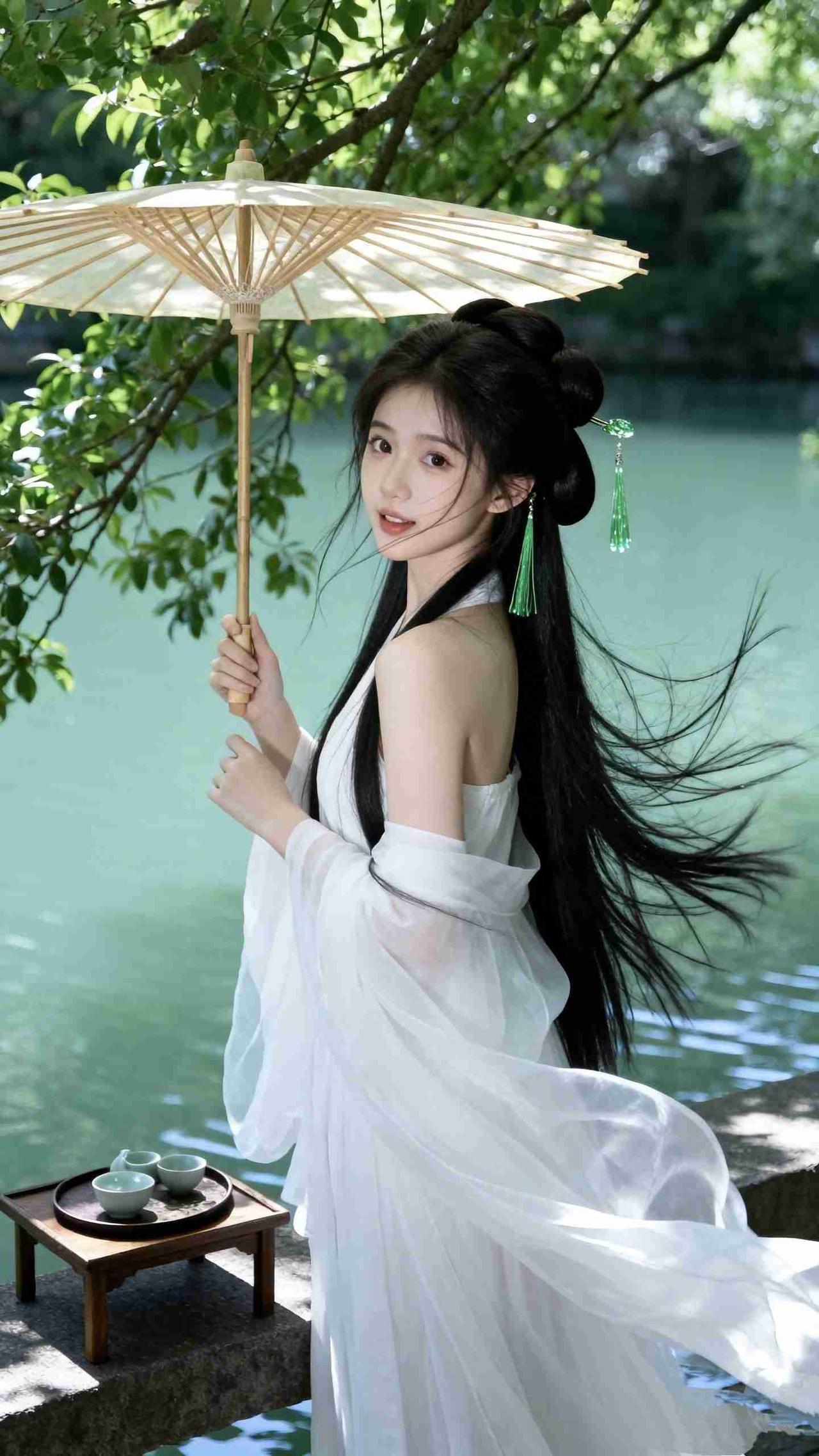 我的今日状态:😡生气 我这里的天气:❄️下雪 《青溪伞影》 绿蔓垂檐,碧溪如镜 你擎一柄素伞,踏碎水光而来 纸伞的骨纹,织着江南的晴光 伞沿漏下的碎阳,吻过你发间的绿流苏 白纱似云,随风漫卷 半露的肩颈,藏着春山的温柔 墨发如瀑,绾成流云的髻 玉簪垂落的翠色,在风里轻晃 拂过眉梢的碎发,撩动眼底的涟漪 石案上,青瓷杯盏静卧 茶汤未凉,映着你回眸的笑意 风掀动衣袂,白纱掠过水面 漾开层层涟漪,像你未说出口的心事 叶隙的光,在伞面跳成碎金 把你的身影,晕成一幅水墨的清欢 远处青山含黛,近处水声潺潺 你立在水畔,与草木同呼吸 伞下的光阴,慢成一首婉约的词 每一缕风,都在诉说江南的温柔 每一片叶,都在记下这一瞬的清绝