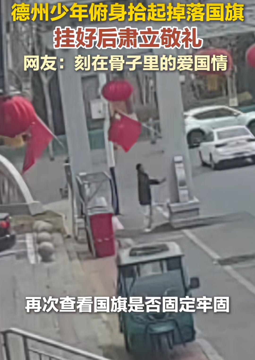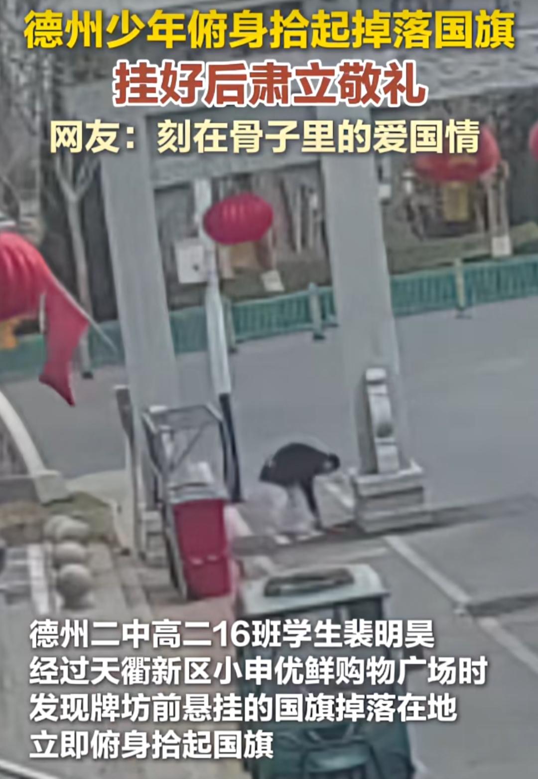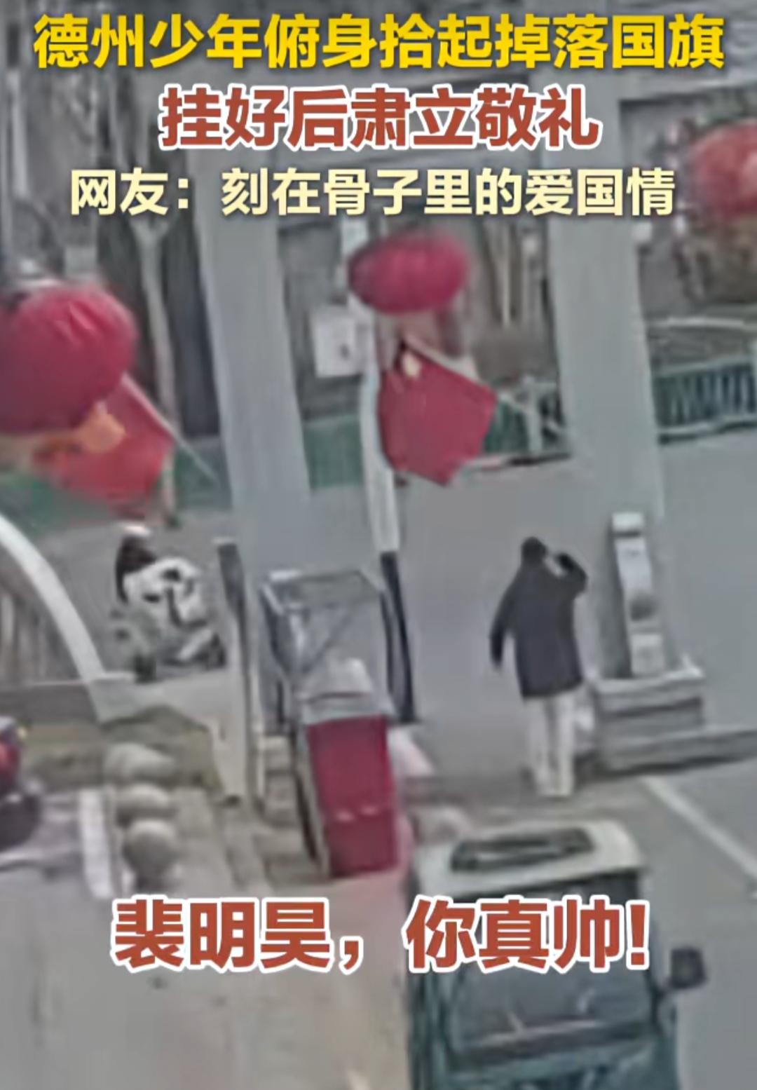 监控里的120秒,没有惊天动地的呐喊,却让无数人红了眼眶。 2月21日的德州街头,风卷着红旗坠落在地。17岁的裴明昊恰好经过,没有丝毫犹豫,他立刻停脚步,弯腰、拾起、抚平褶皱,踮起脚将国旗稳稳挂回牌坊上。确认固定牢固后,他后退一步,挺直脊背,对着迎风舒展的五星红旗,敬了一个标准而庄重的礼。随后,他默默转身,汇入人流,仿佛刚才的一切只是再平常不过的小事。 面对采访,这个德州二中的少年语气平淡得像在说“今天吃了什么”:“看到国旗掉在地上,捡起来挂好是应该做的。在学校升旗仪式上,老师常讲国旗代表国家,挂好后就想敬个礼。” 一句“应该做的”,藏着刻在骨子里的教养与信仰。我们总在追问“爱国是什么”,裴明昊用行动给出了最朴素的答案:它不是口号,是看见国旗落地时本能的驻足,是整理褶皱时指尖的温柔,是敬礼时挺直的脊梁。这不是刻意的表演,是从小在升旗仪式、课堂教诲里种下的种子,在某个平凡瞬间自然生长的模样。 网友们刷屏点赞:“裴明昊,你真帅!”这份帅,无关颜值,是少年眼里的光,是刻进民族基因里的家国情怀。当我们感慨“少年强则国强”时,这样的身影就是最好的注脚——他们接过的不仅是一面国旗,更是一个民族的尊严与未来。 这世上最动人的力量,从来都藏在这些不经意的瞬间里。它提醒我们:爱国从来都不是遥远的宏大叙事,它就在每一次弯腰、每一次敬礼、每一个“应该做的”选择里。少年护旗 最美弯腰