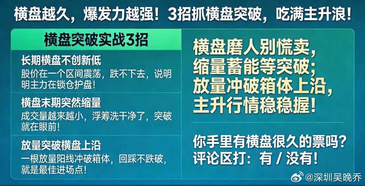 横盘越久,爆发力越强!3招抓横盘突破,吃满主升浪!散户总嫌横盘磨人,拿不住就割,结果一卖就直线拉升!其实横盘是主力在蓄能,横得越久,后面涨得越猛!今天3招大白话,教你抓横盘突破,不被洗下车,吃完整段主升!横盘突破实战3招,直接照做1. 长期横盘不创新低股价在一个区间震荡,跌不下去,说明主力在锁仓护盘!2. 横盘末期突然缩量成交量越来越小,浮筹洗干净了,突破就在眼前!3. 放量突破横盘上沿一根放量阳线冲破箱体,回踩不跌破,就是最佳进场点!核心口诀横盘磨人别慌卖,缩量蓄能等突破;放量冲破箱体上,主升行情稳稳握!耐住横盘的寂寞,才能守住拉升的利润!你手里有横盘很久的票吗?评论区打:有 / 没有!